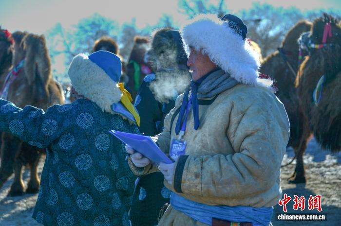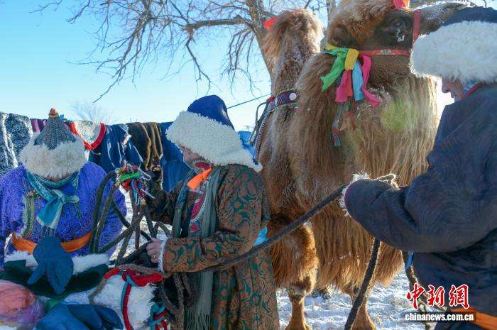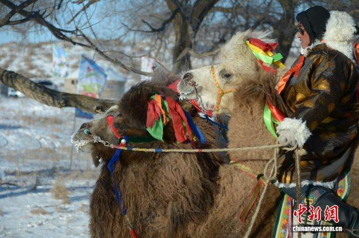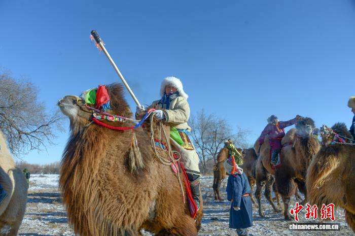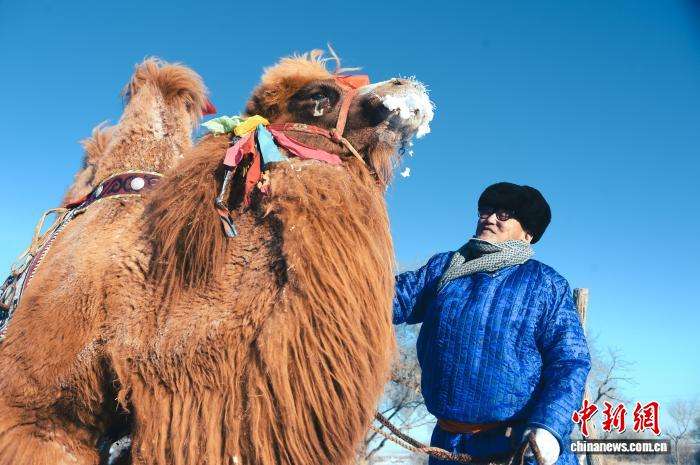 近日,浑善达克沙地深处的牧民家里,举办了一场“最美公驼”评选。2026年“歌游内蒙古 百姓大舞台”锡林郭勒盟群众文化那达慕·冬季村晚将场地定在内蒙古自治区正蓝旗扎格斯台苏木巴音宝力格嘎查的一户牧民家。作为活动内容之一,“最美公驼”评选吸引了周边数十户牧民牵着骆驼参赛。图为参赛的骆驼和牧民。