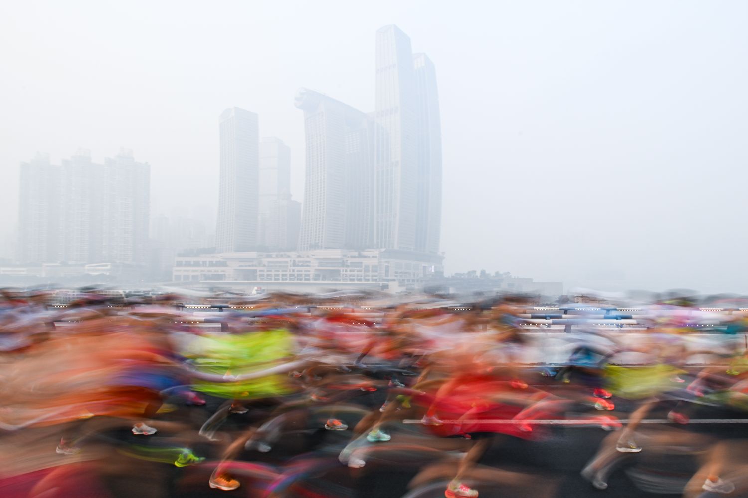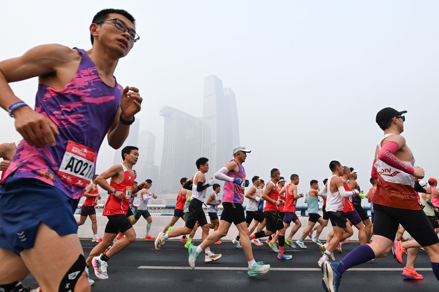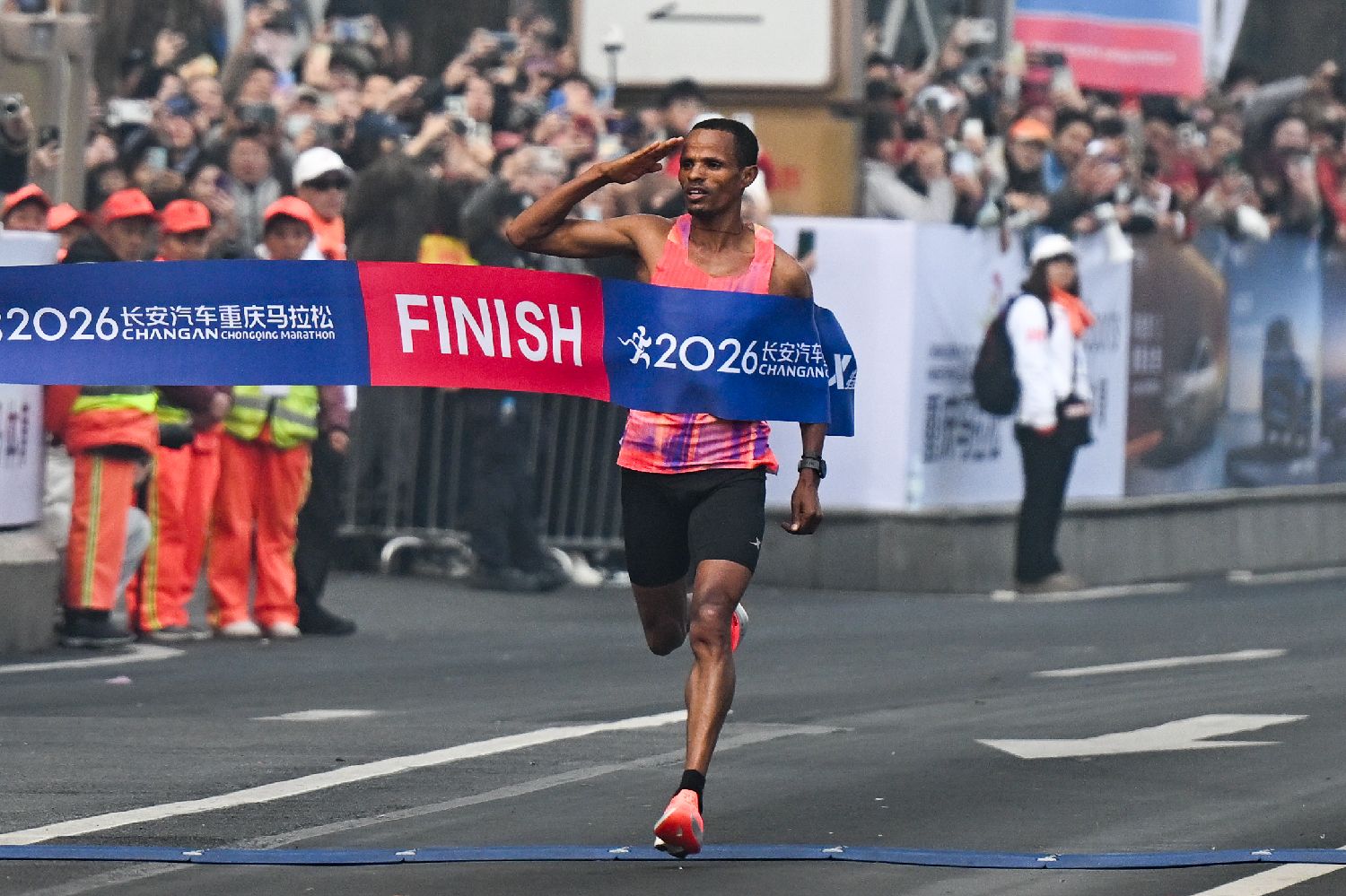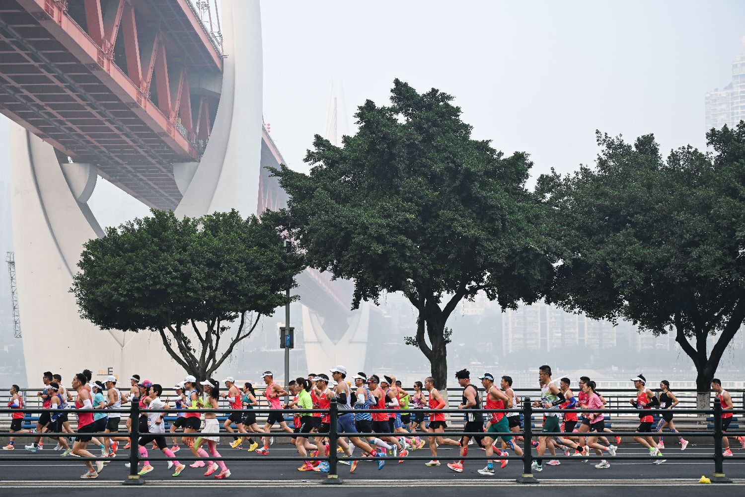 1月18日,2026重庆马拉松在重庆市南岸区南滨路海棠烟雨公园鸣枪起跑,吸引来自26个国家和地区的2.5万名选手参赛,在长江之滨演绎速度与激情。图为选手在比赛中。中新社