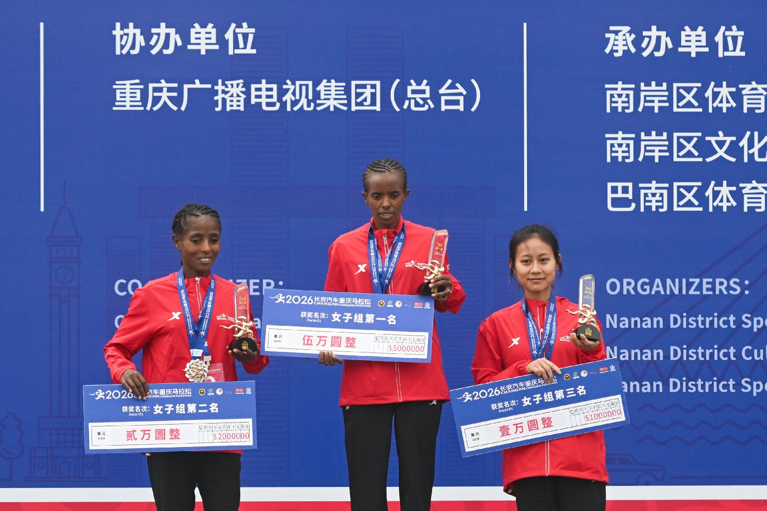 中国选手朱卿以2小时28分53秒的成绩获得季军,国内女子组第一名。图为朱卿(右一)在颁奖仪式上。中新社