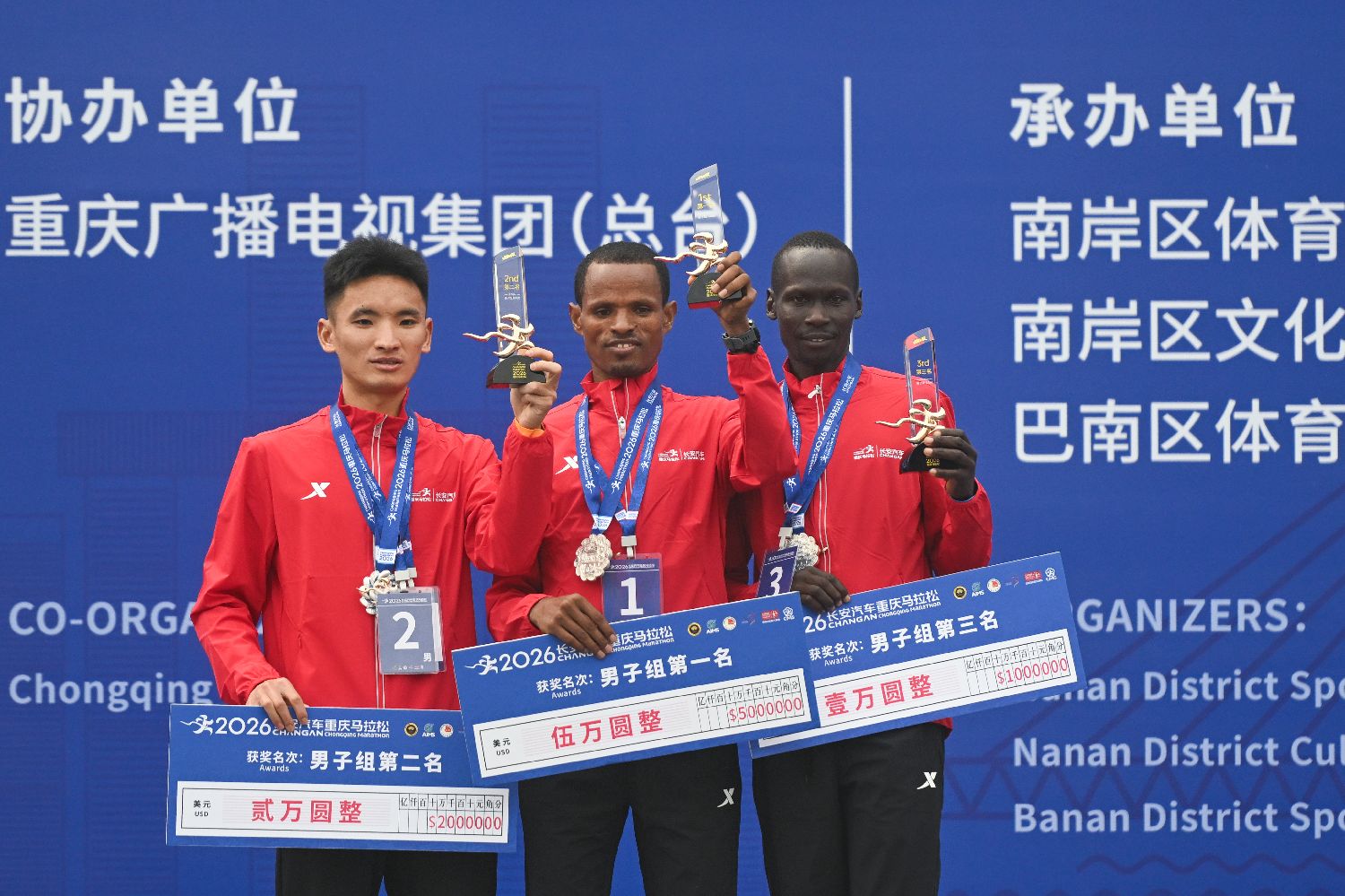中国选手丰配友以2小时10分22秒的成绩获得亚军,国内男子组第一名,并打破由董国建在2016年重马创造的中国籍赛会纪录。图为丰配友(左一)在颁奖仪式上。中新社