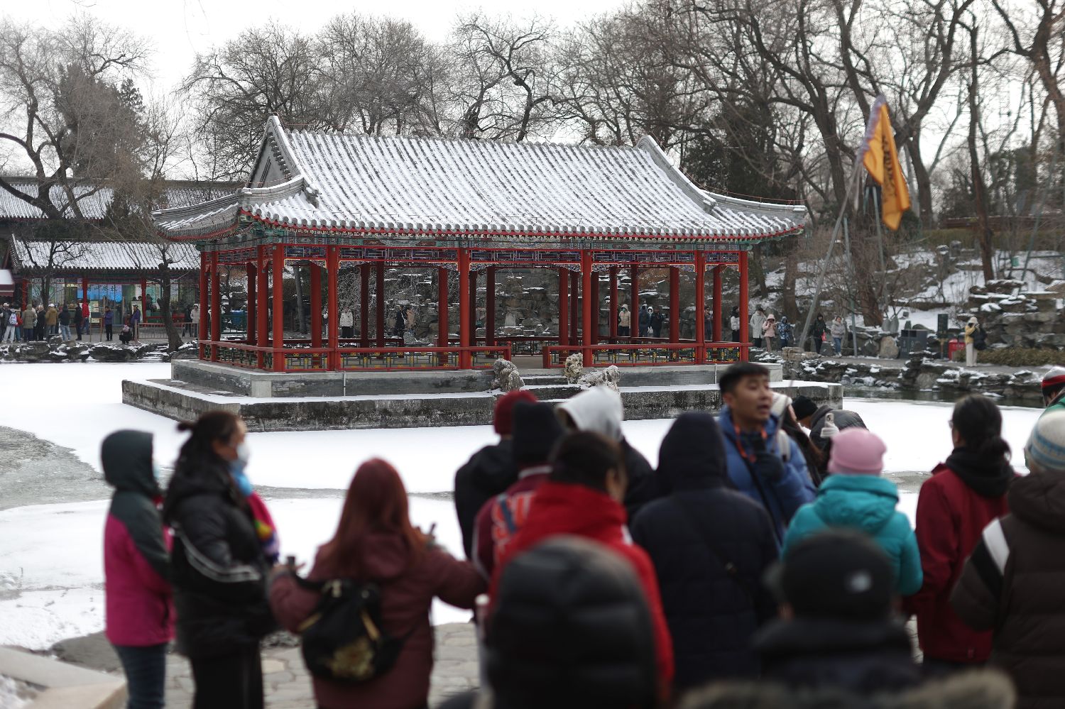 近日,中国多地迎来降雪,民众观雪景,参与冰雪活动,尽情享受冬日雪趣。图为1月18日,民众在北京恭王府赏雪景。中新社