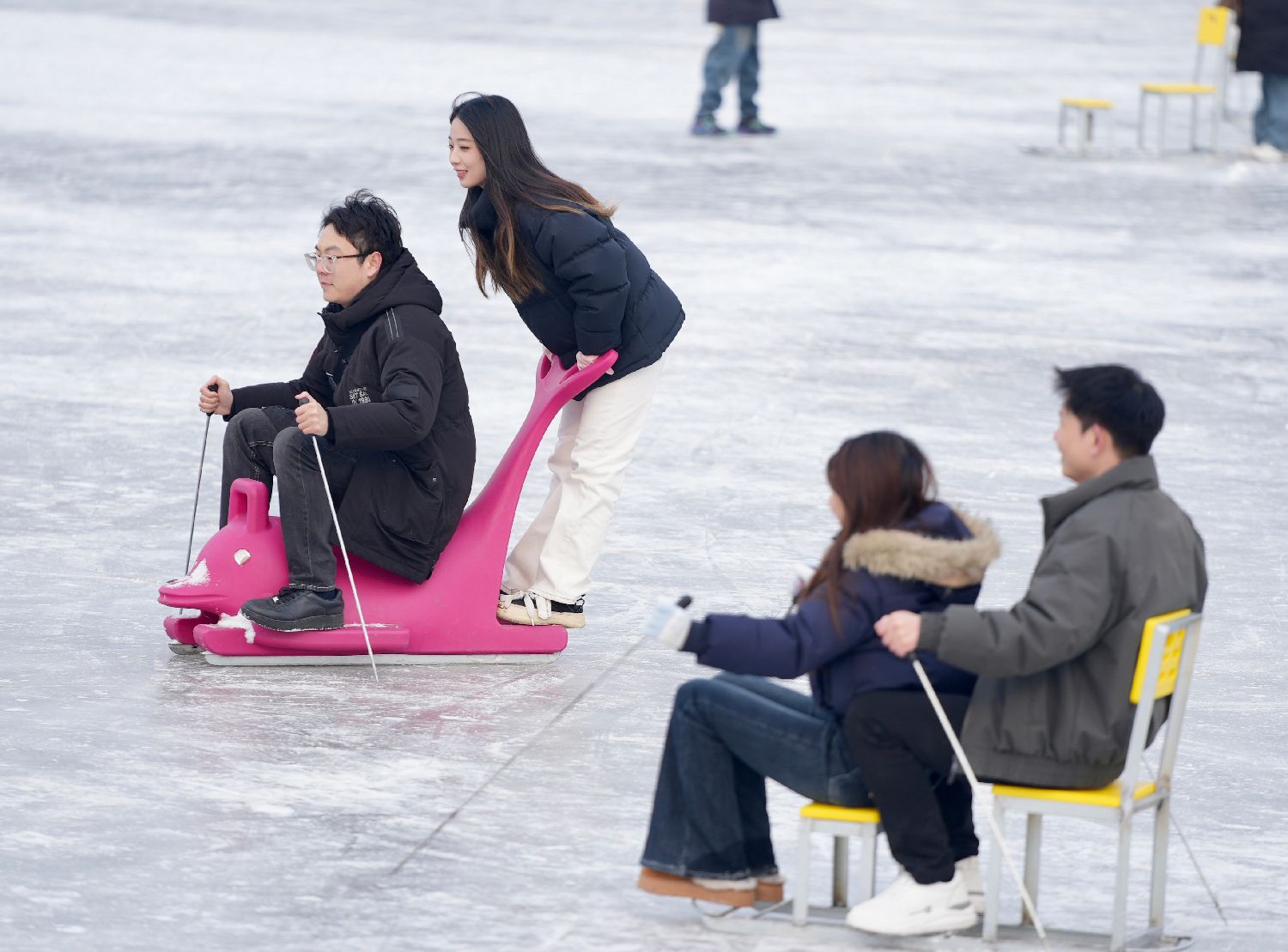 1月18日,市民在北京奥园龙形水系冰场滑冰乐享周末。中新社