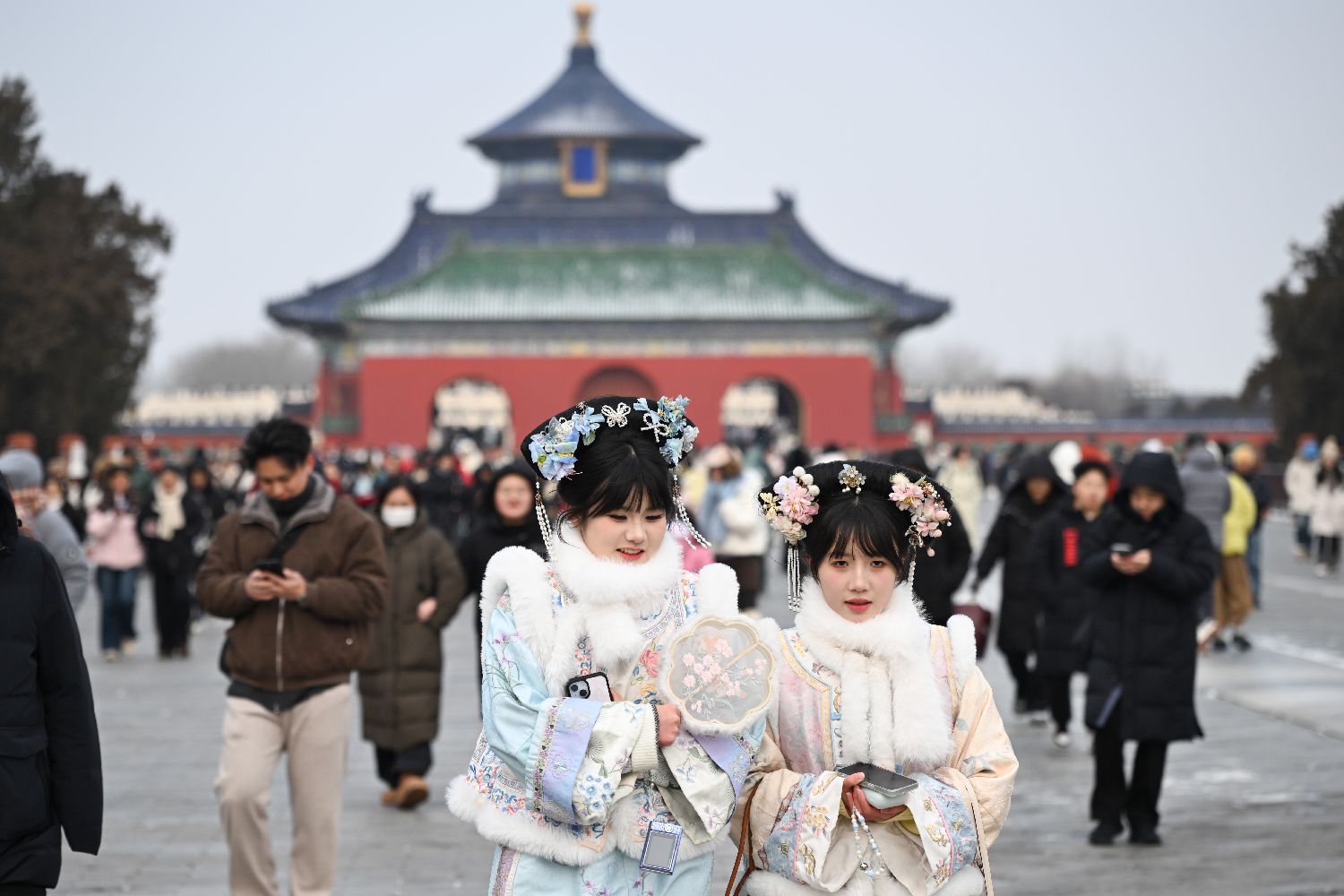 1月18日,北京雪后初晴,游客在天坛公园游览、赏雪。中新社