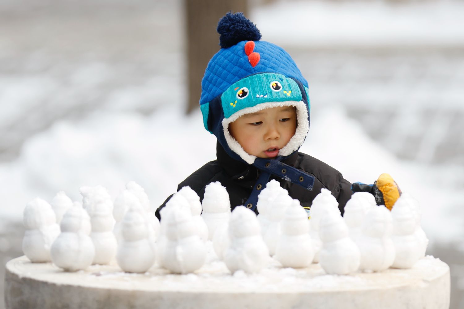 1月18日,北京降雪,小朋友在大观园内数雪人。中新社