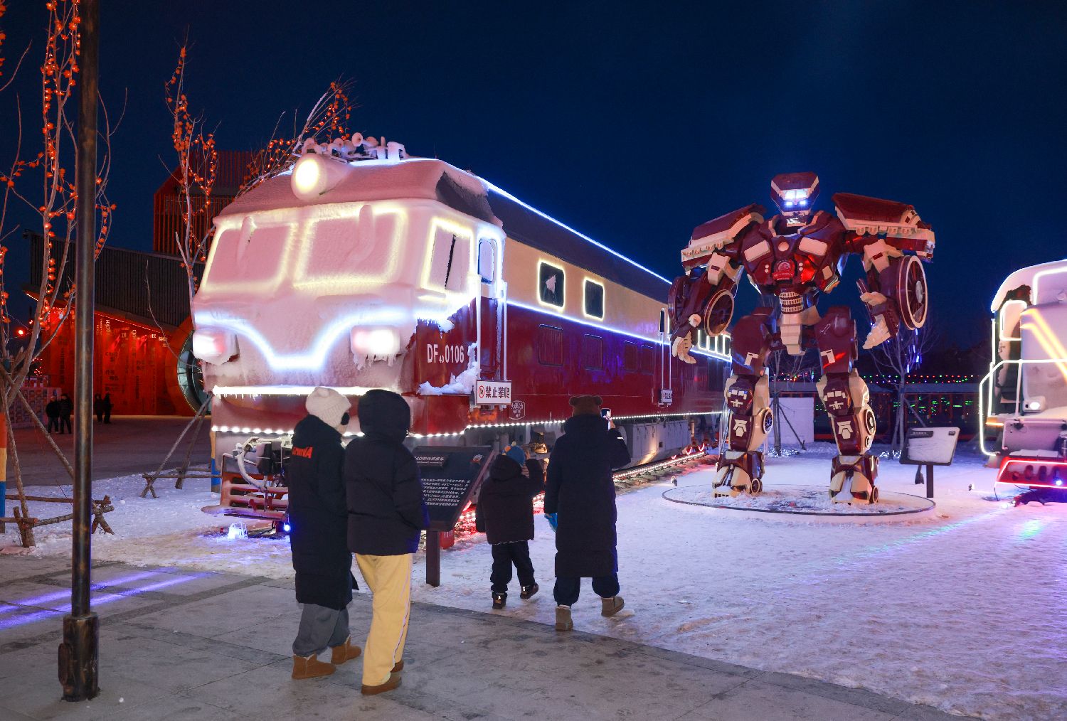 1月18日,游客在位于吉林大安的中国·大安机车博览园内打卡拍照。中新社