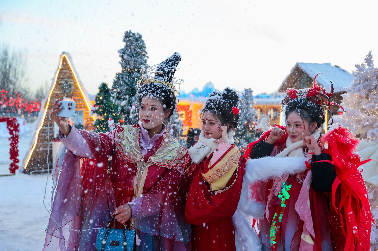 1月17日,青海西宁,市民观赏冰雕、逛灯会,乐享周末时光。图为民众身着汉服打卡留念。中新社