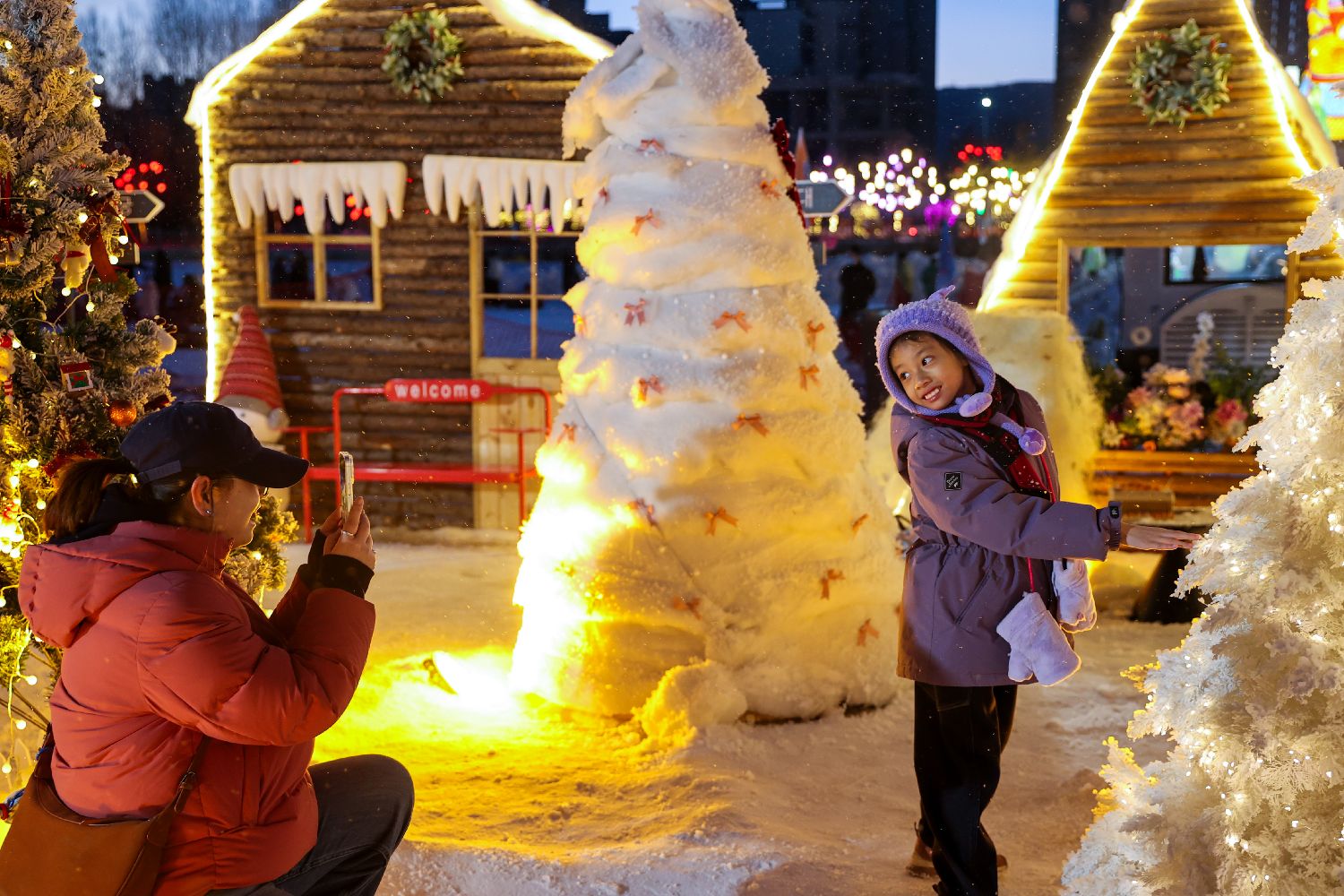 1月18日,河北石家庄迎来降雪,小朋友在正定冰雪嘉年华拔河,尽情享受冬日雪趣。中新社