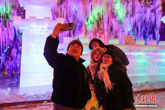 1月17日,青海西宁,市民观赏冰雕、逛灯会,乐享周末时光。中新网