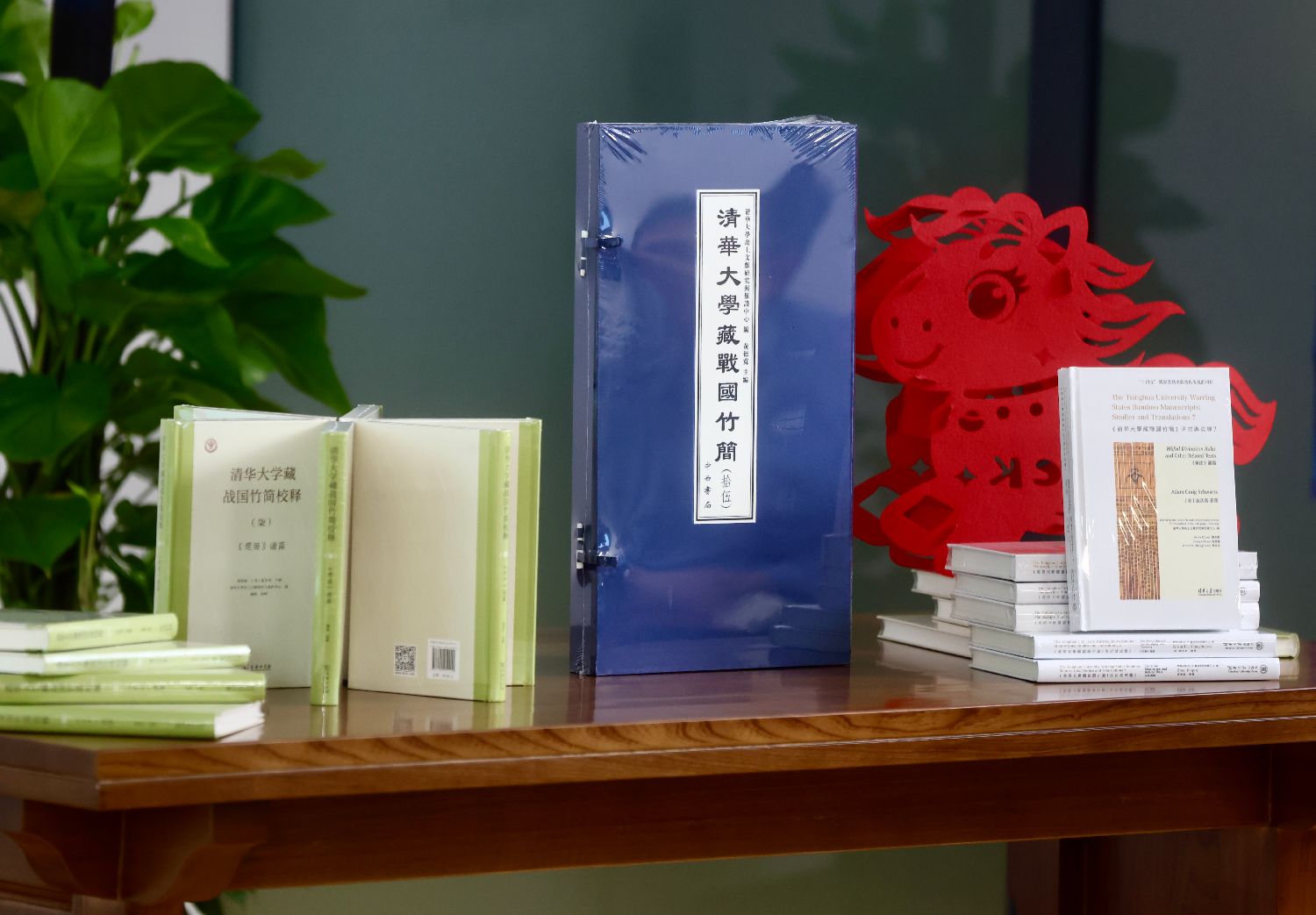 1月19日,清华大学出土文献研究与保护中心联合中西书局、商务印书馆、清华大学出版社,在北京主办《清华大学藏战国竹简(拾伍)》暨校释、英译系列成果发布会。图为《清华大学藏战国竹简(拾伍)》及校释、英译书籍。中新社