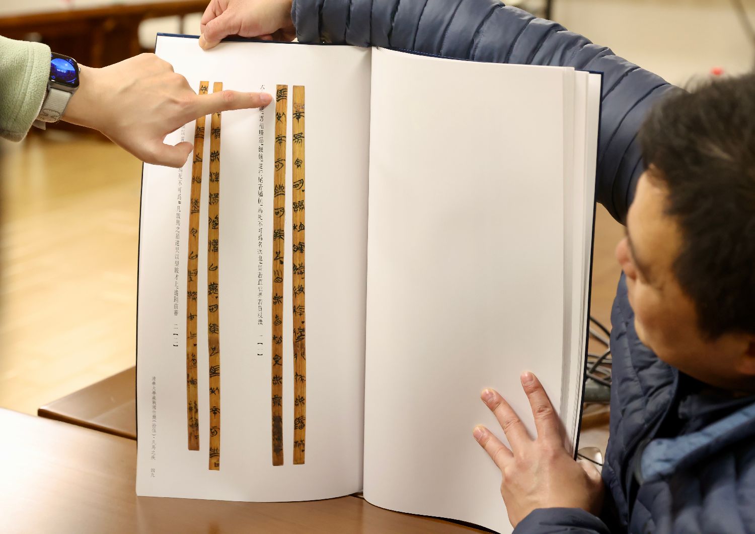 工作人员展示《清华大学藏战国竹简(拾伍)》内页及“马”字。中新社