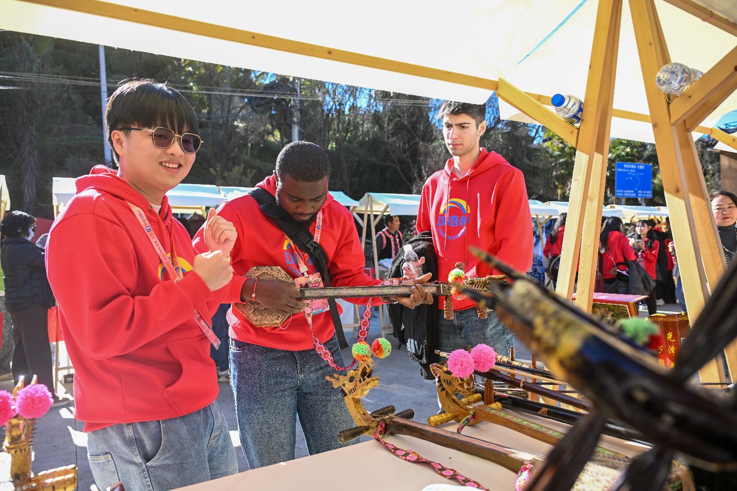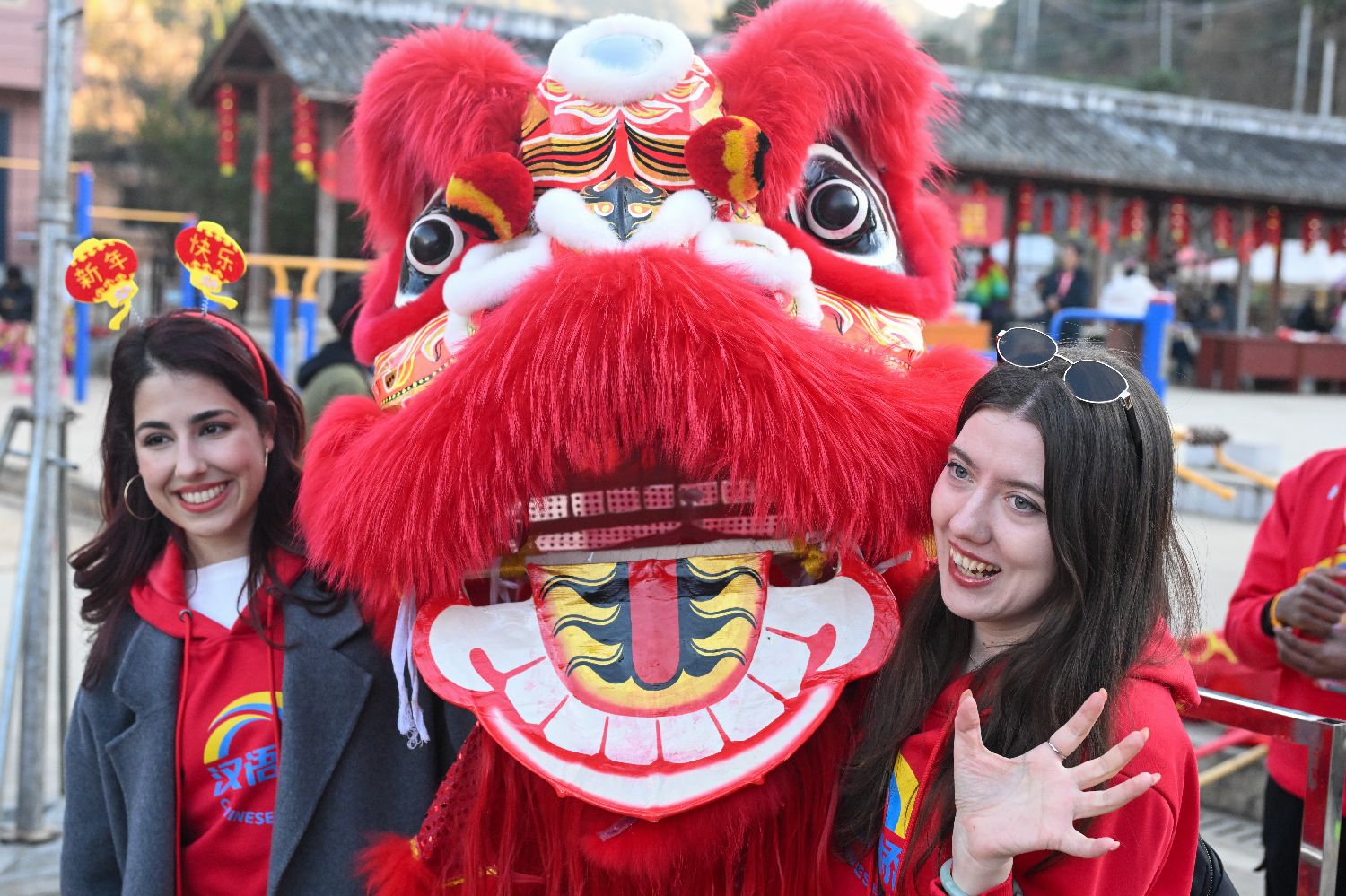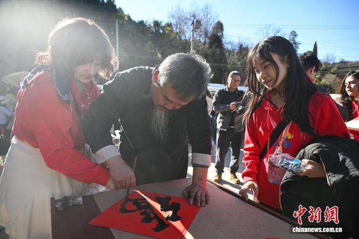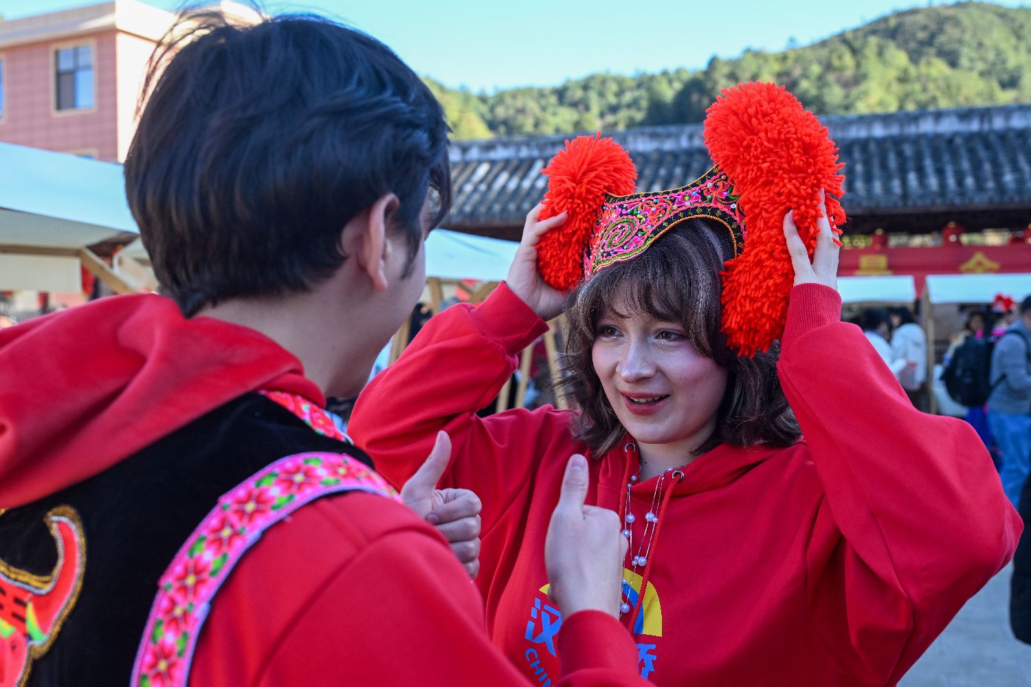 中国春节临近,来自美国、比利时等33个国家的50余名“汉语桥”优秀选手齐聚云南省昆明市大墨雨村,写春联、了解彝绣、制作甲马、品味民族菜,提前感受中国乡村年味。图为1月19日,“汉语桥”选手试戴彝族“鸡冠帽”。中新社