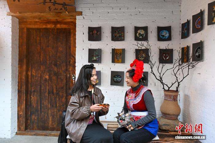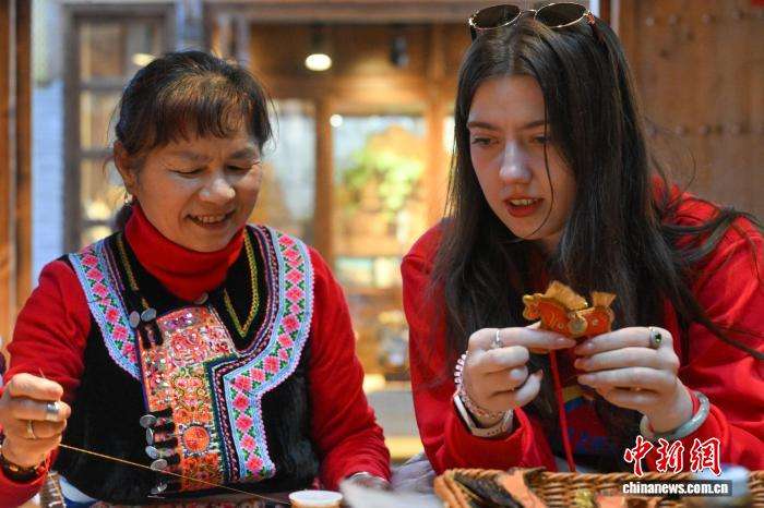 1月19日,大墨雨村村民向“汉语桥”选手讲解彝绣小马制作方法。中新网