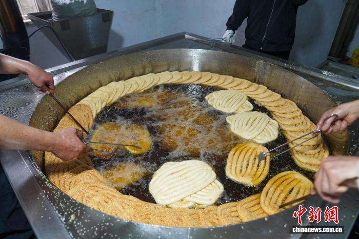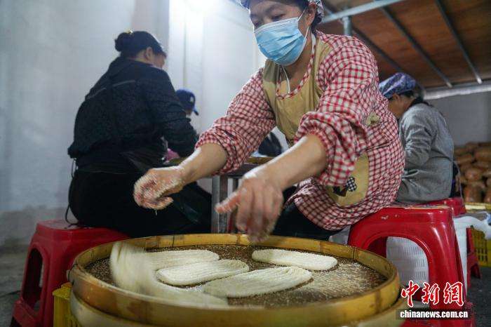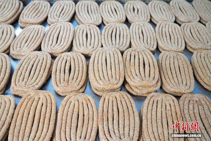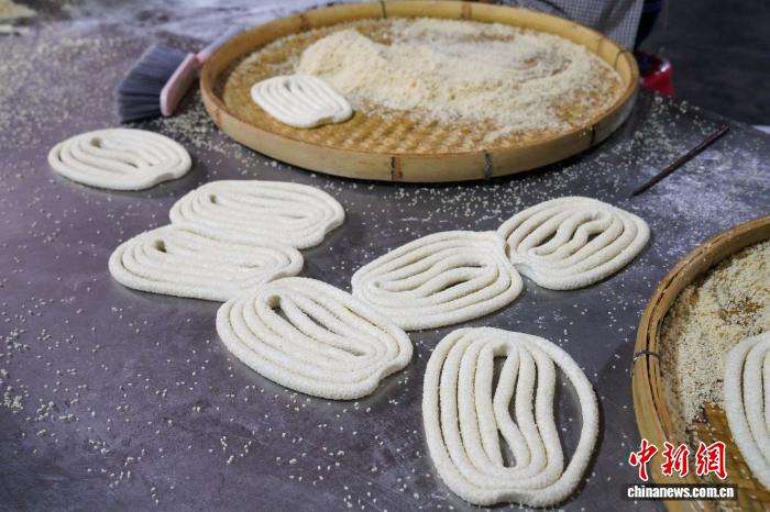 1月19日,广西贺州市富川瑶族自治县的一家粿条厂内,经过十余名工人揉搓、盘绕和油炸,一张张形似草鞋的粿条成型。粿条形似瑶族草鞋,承载着“亲友常走动”的文化寓意,每家每户过年期间都会准备几十斤至上百斤不等的粿条,用于接待或走亲访友,是当地重要的“年味”载体。图为工人正在制作“草鞋”粿条。