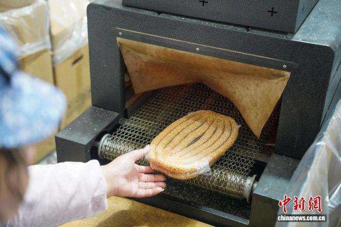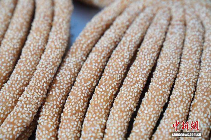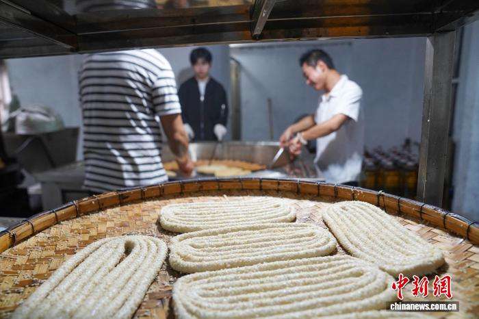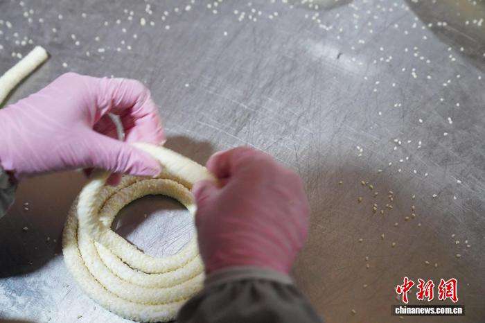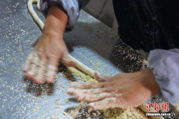 工人通过揉搓把芝麻粘在“草鞋”粿条上。