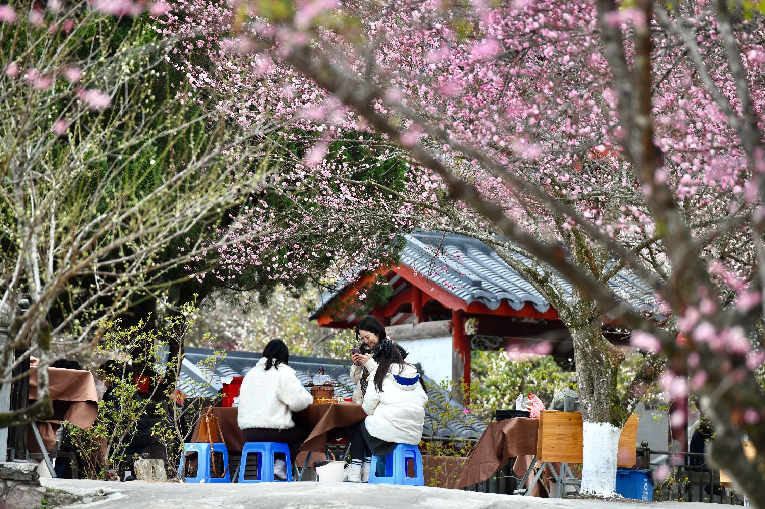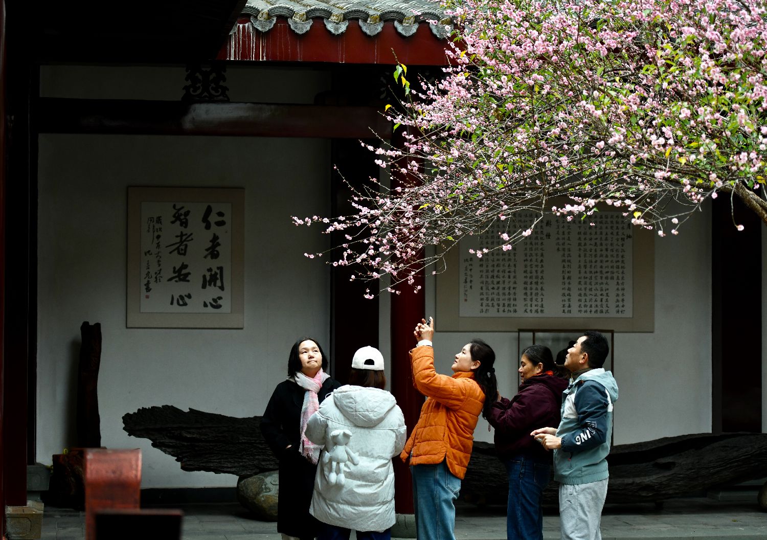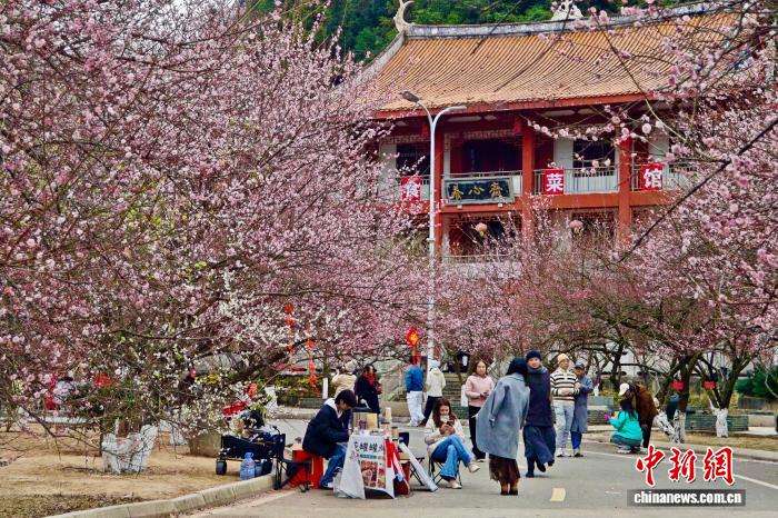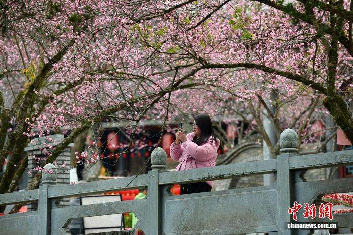 眼下正值赏梅黄金期,大批市民游客慕名前往福建福州千年古刹林阳寺赏梅,或穿行梅林间打卡留影,或于梅树下围炉煮茶,在古寺的静谧氛围中尽享梅香禅韵。图为1月20日,游客在林阳寺赏梅。中新网