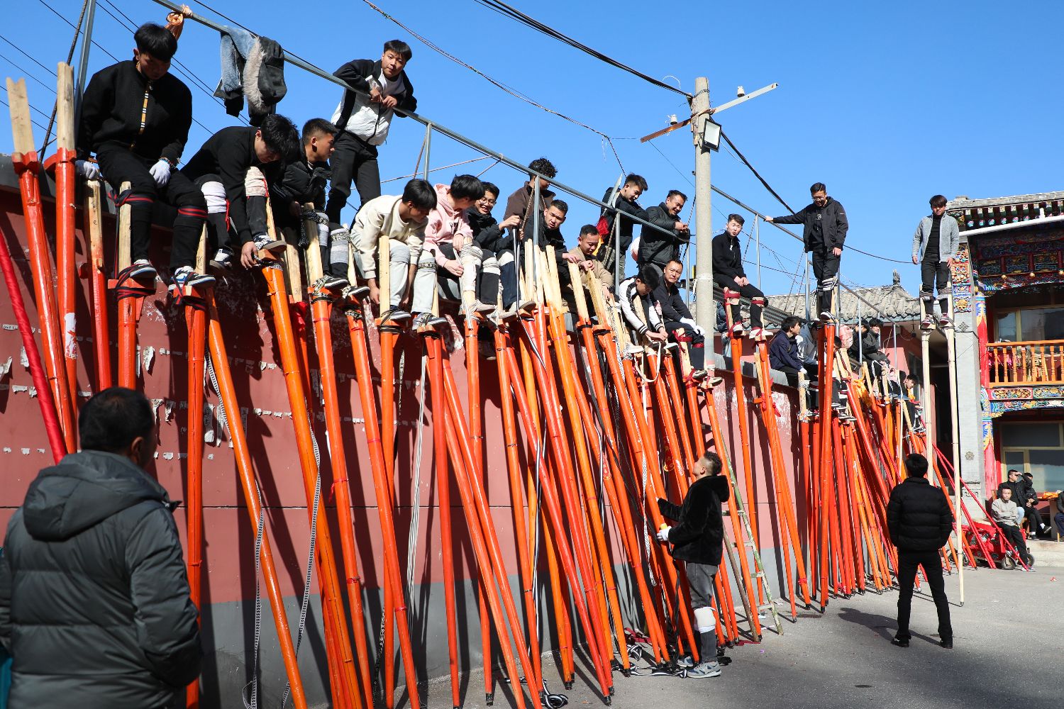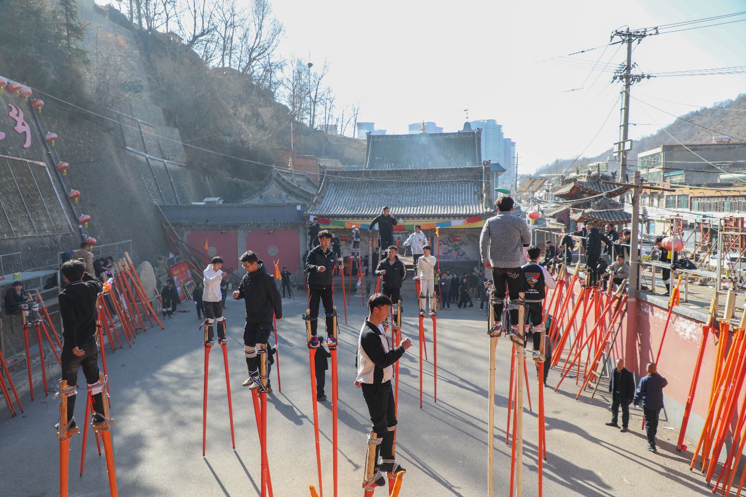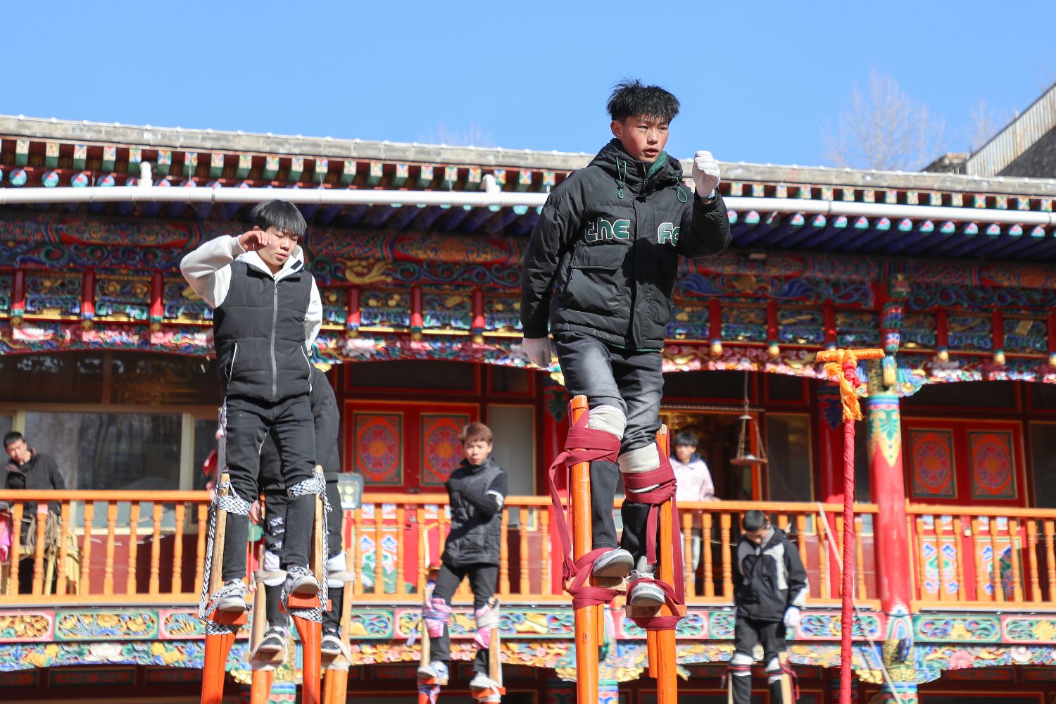1月22日,青海湟中,返乡大学生和“10后”青少年参与传统社火高跷排练。中新网