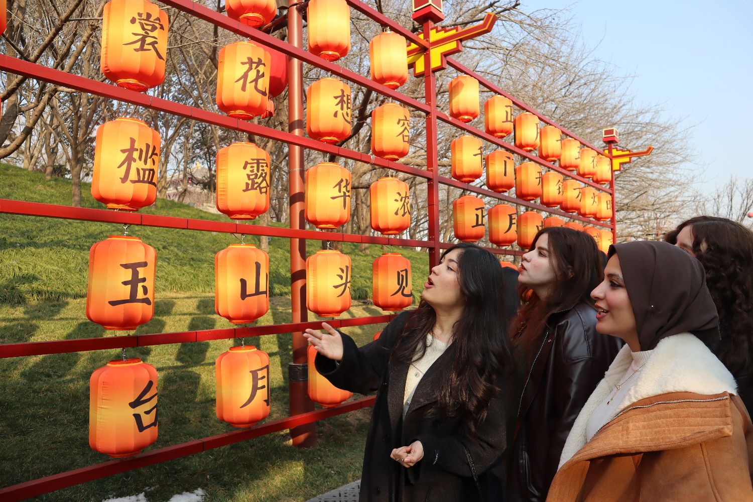1月22日,“芙蓉诗灯耀长安”外籍友人走读西安活动在西安大唐芙蓉园举行,来自韩国、埃及等国的二十余位外籍友人,游园赏灯、吟诵唐诗,沉浸式感受盛唐气象,体悟古都西安的文化魅力。图为外籍友人在大唐芙蓉园“唐诗灯组”旁朗读唐诗。中新社
