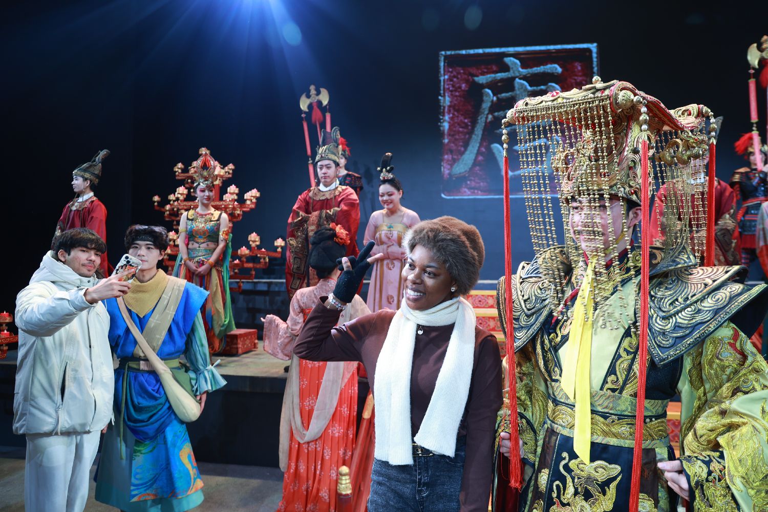 外籍友人在大唐芙蓉园内与《梦回大唐》舞剧演职人员合影。中新社