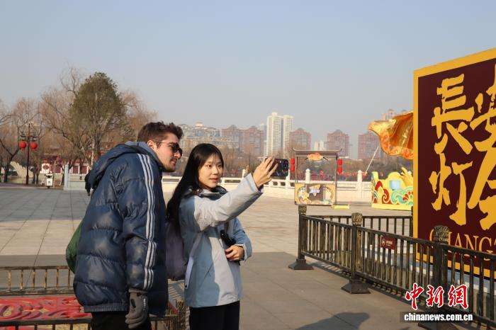 外籍友人在大唐芙蓉园灯会入口处拍照留念。中新网
