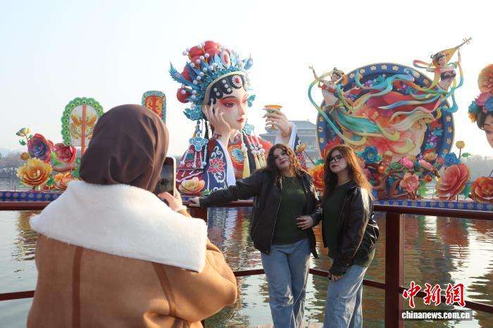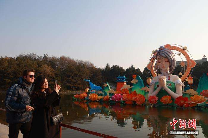 外籍友人在大唐芙蓉园一组花灯前拍照留念。中新网