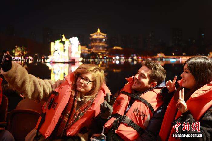 外籍友人夜间在大唐芙蓉园内乘船赏灯。中新网