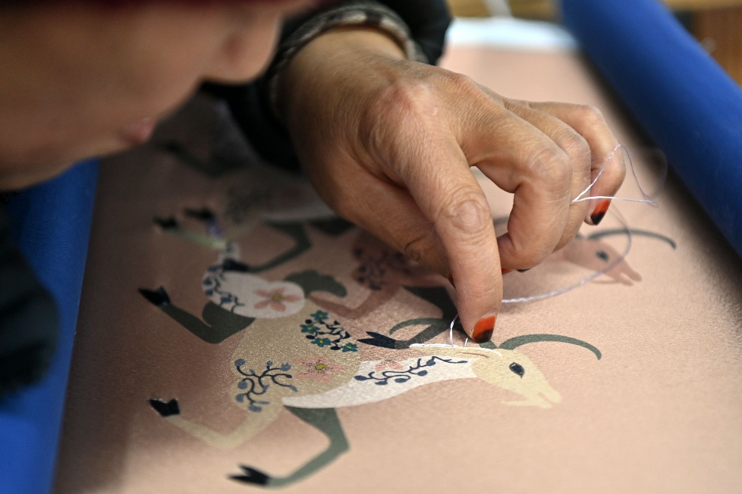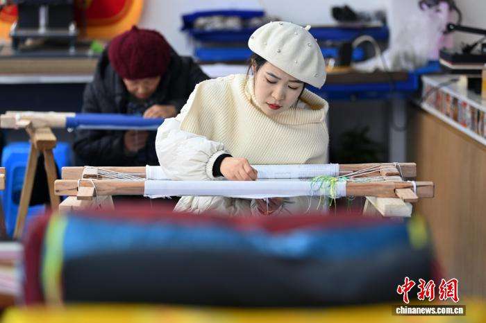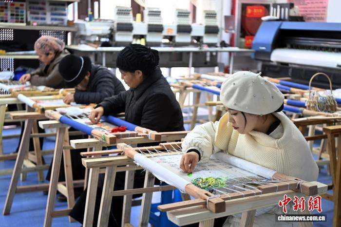 如今,东乡绣娘们通过创新设计,将刺绣融入现代生活,探索市场化发展,甚至已经走上国际时尚舞台。图为1月22日,在位于甘肃临夏回族自治州东乡族自治县的锁南镇城南社区刺绣枢纽内,东乡族绣娘们正在制作背包、挂件等刺绣产品。中新网