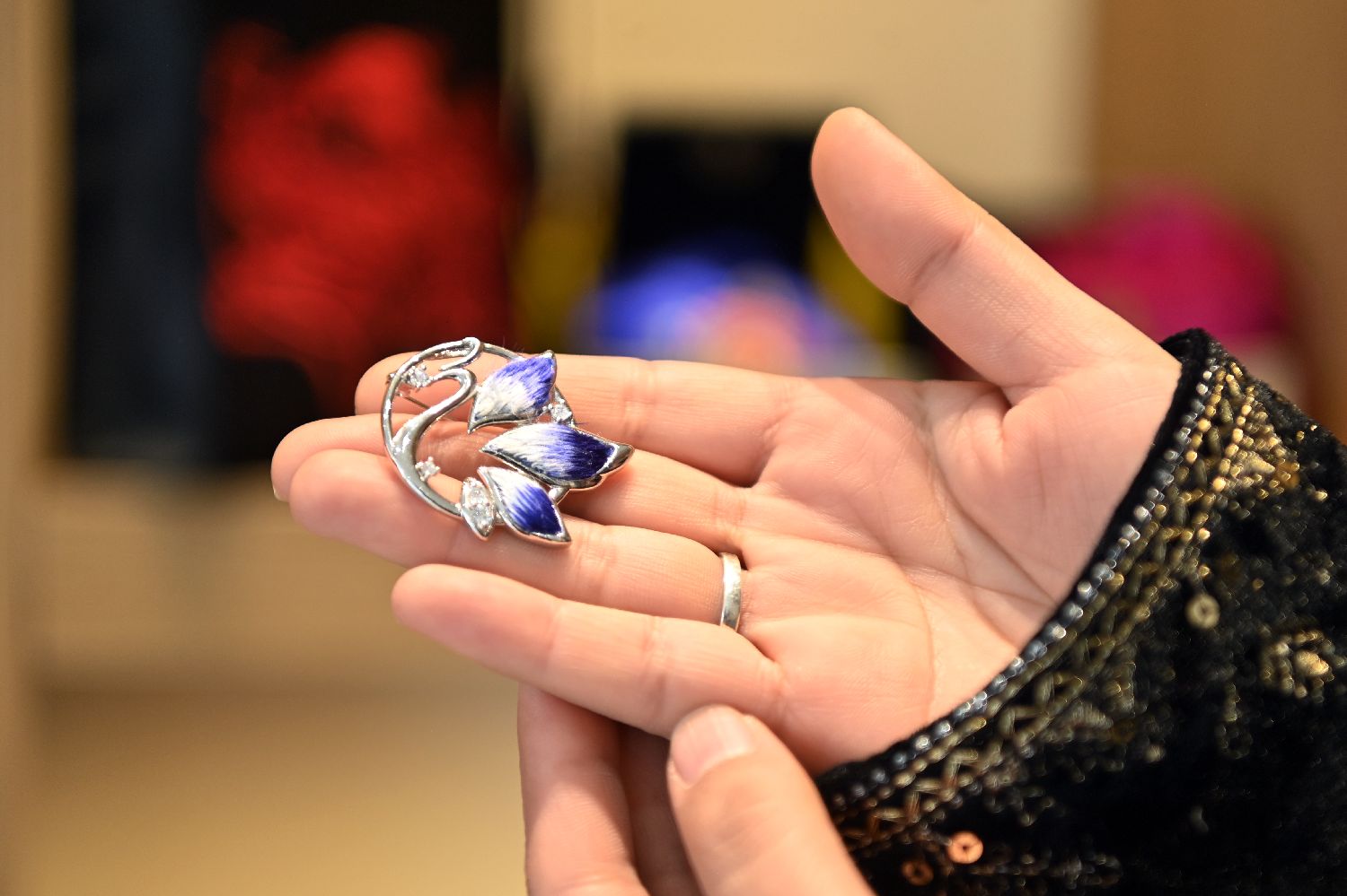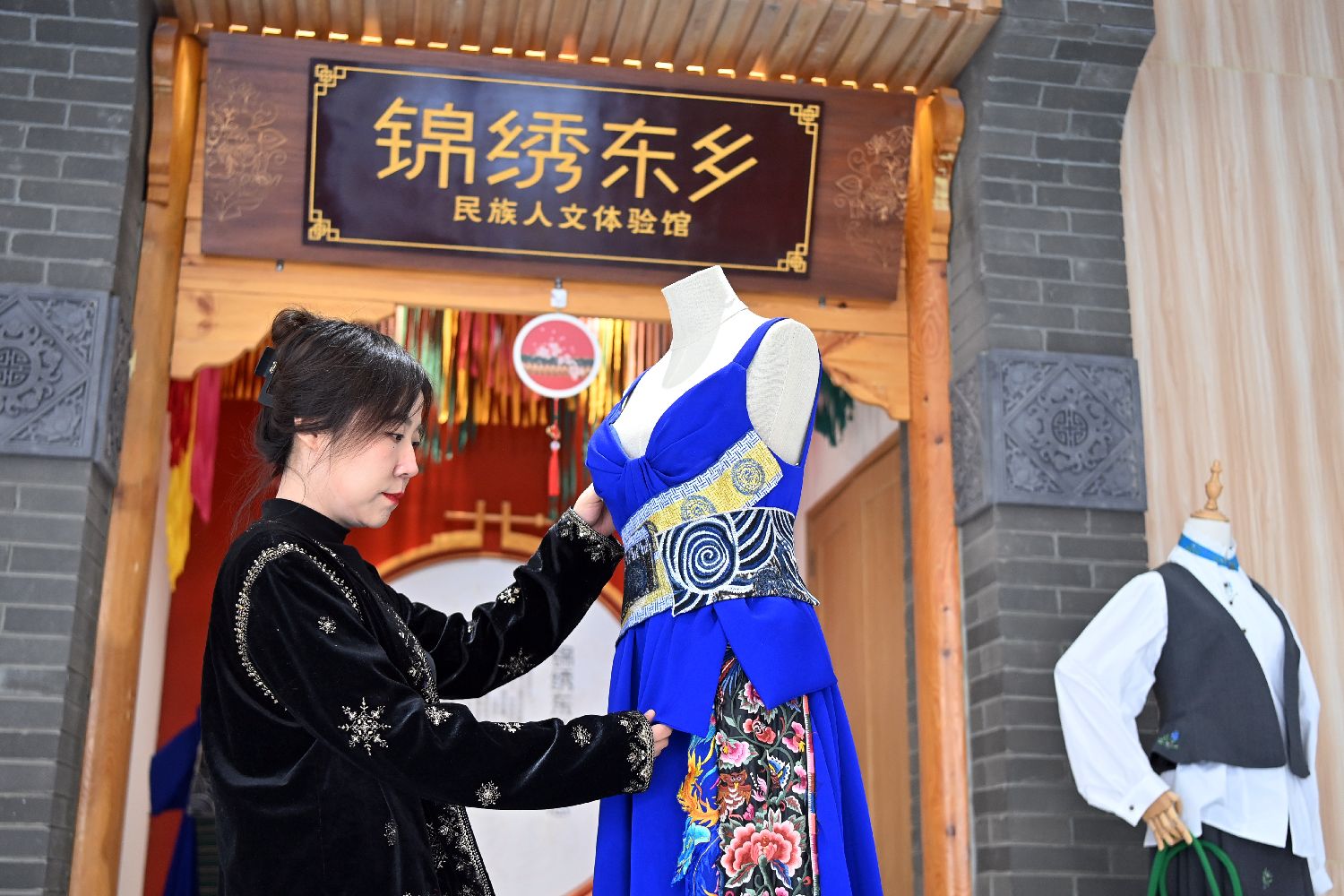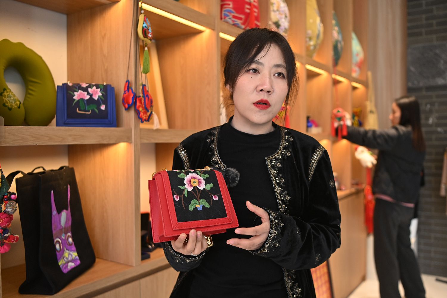 马箫箫展示“东乡刺绣”产品。中新社