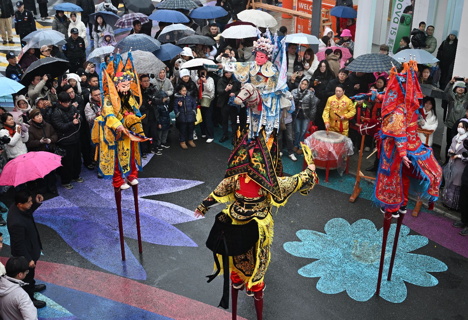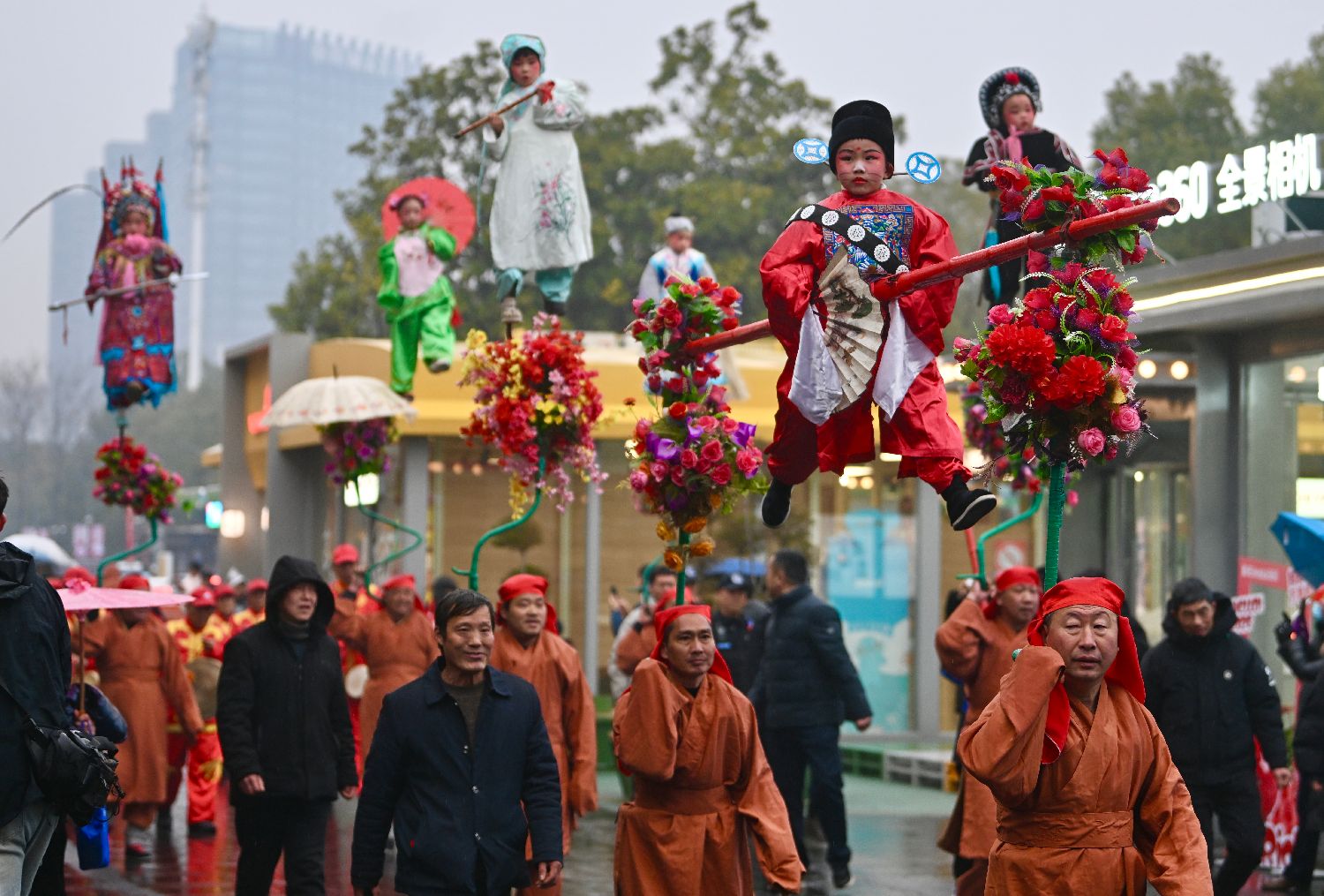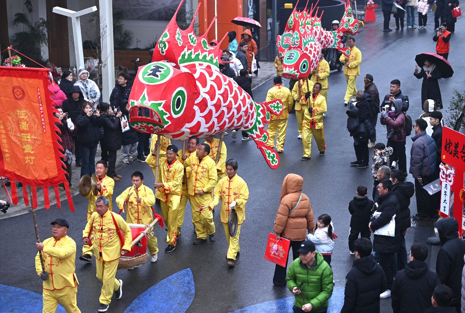 1月25日,“我们的节日——欢欢喜喜过大年”2026春节主题文旅活动在安徽省合肥市举行。黄山鱼灯、池州傩舞、肘阁抬阁等安徽特色民俗项目轮番登场,民众尽览徽风皖韵的独特魅力。图为黄山汪满田鱼灯穿梭巡游。中新社