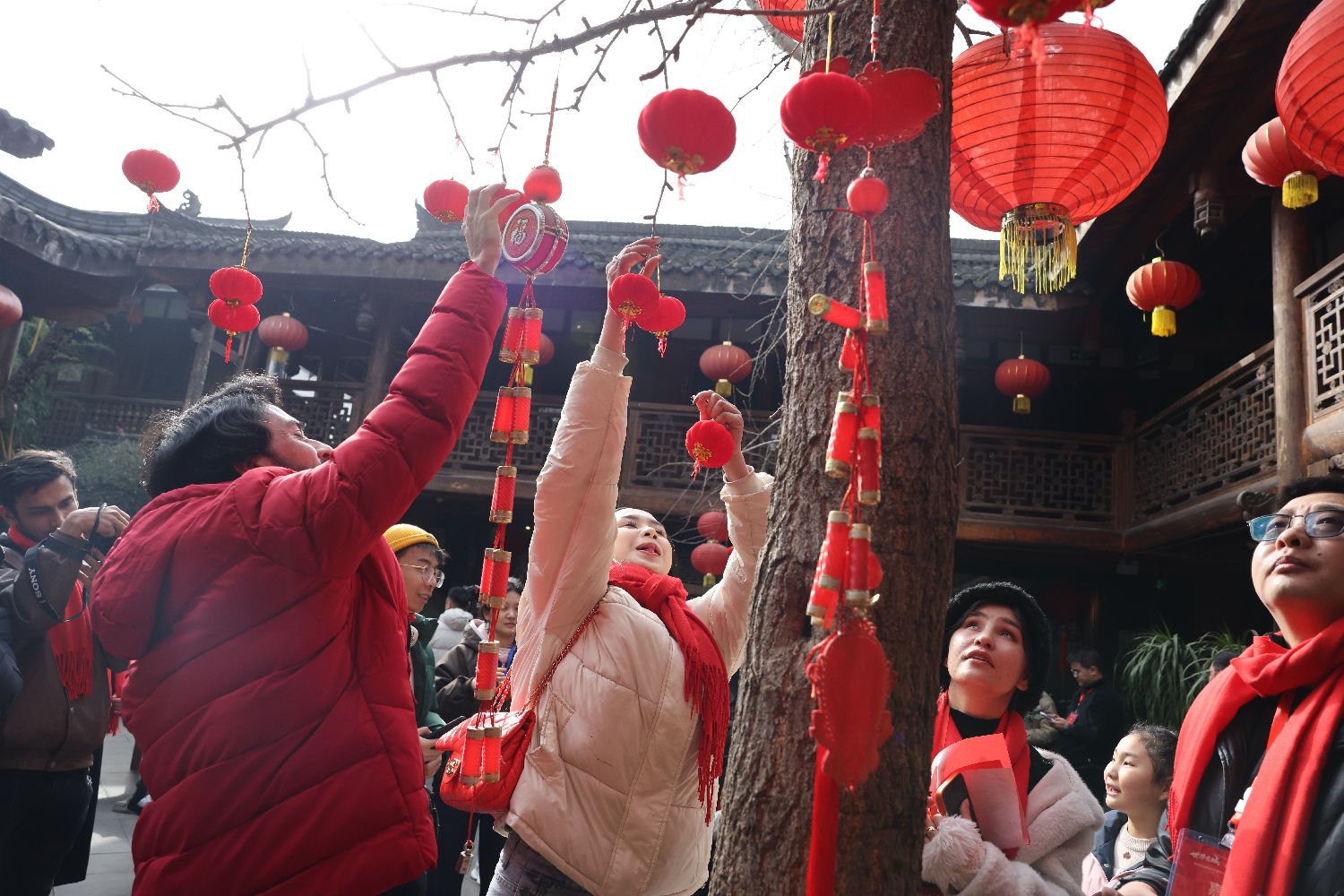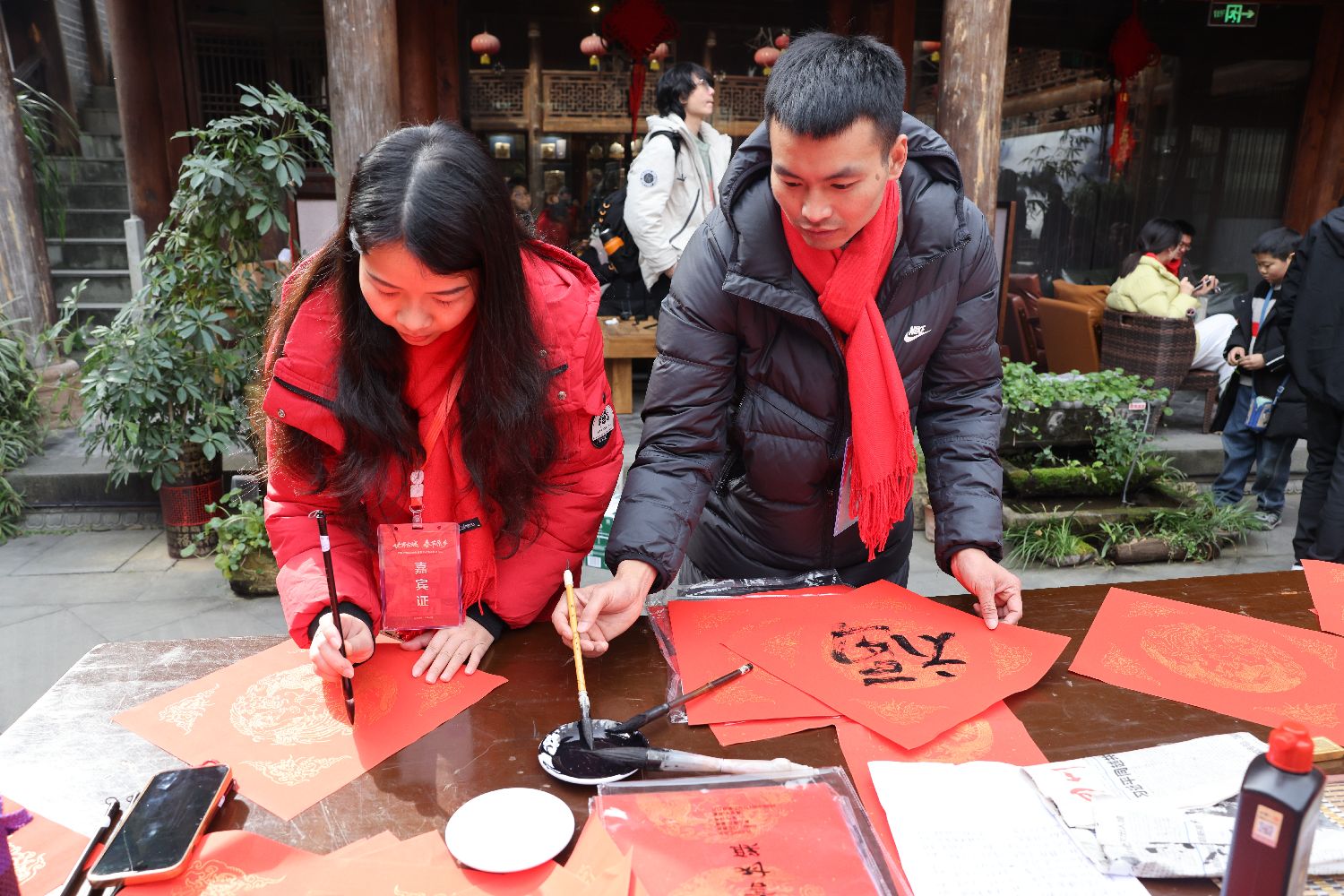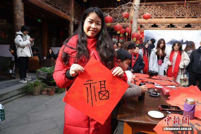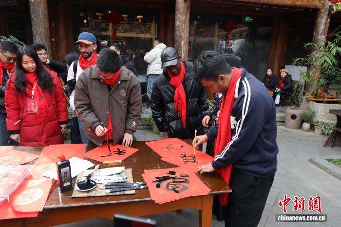 1月26日,在四川阆中举行的2026阆中古城过大年春节文化系列活动中,一群来自西华师范大学的外籍留学生在古城内通过贴春联、写“福”字、挂灯笼等,体验中国春节文化。图为留学生学写“福”字。中新社