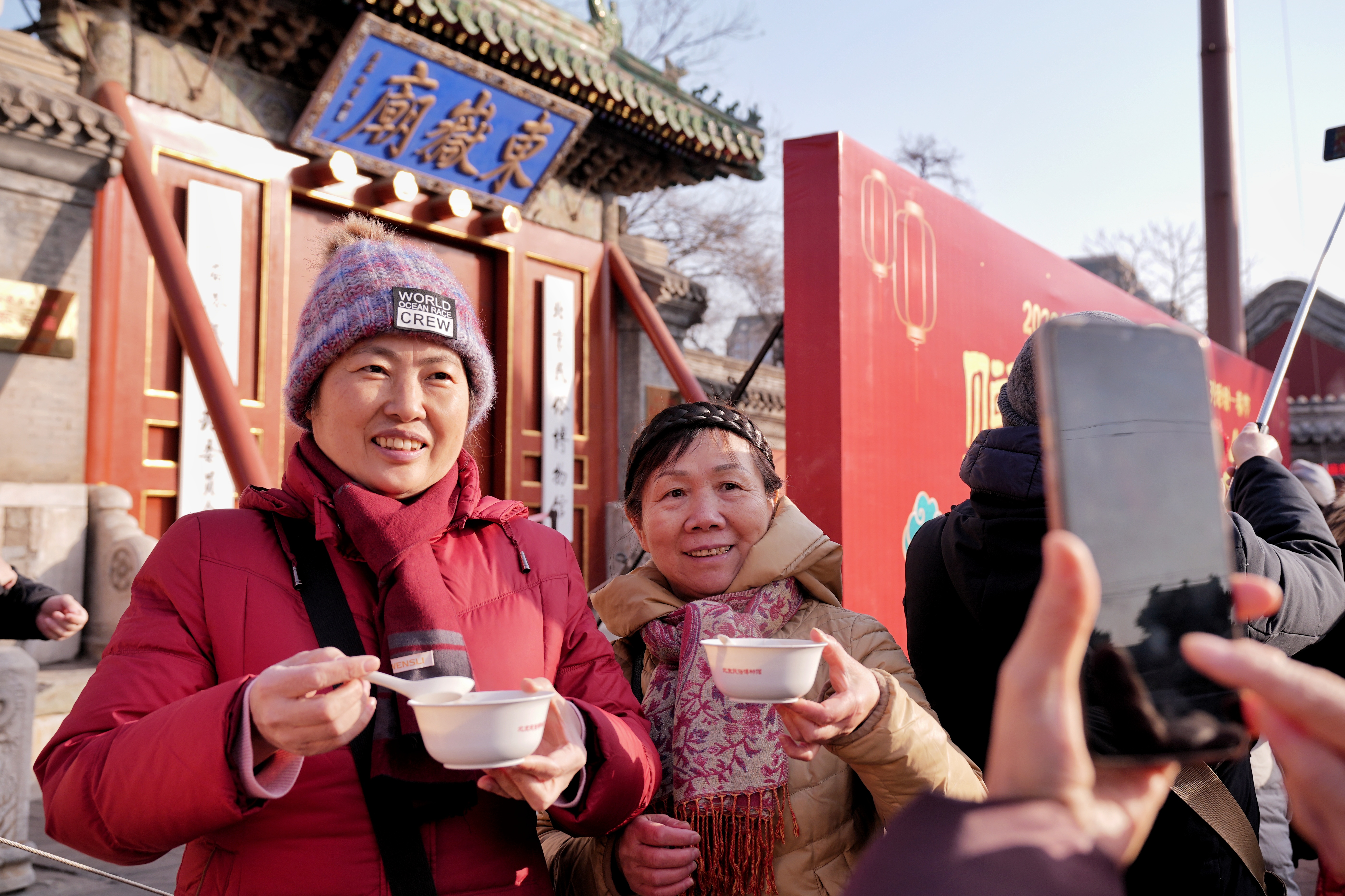 1月26日,市民在北京民俗博物馆品粥。中新社