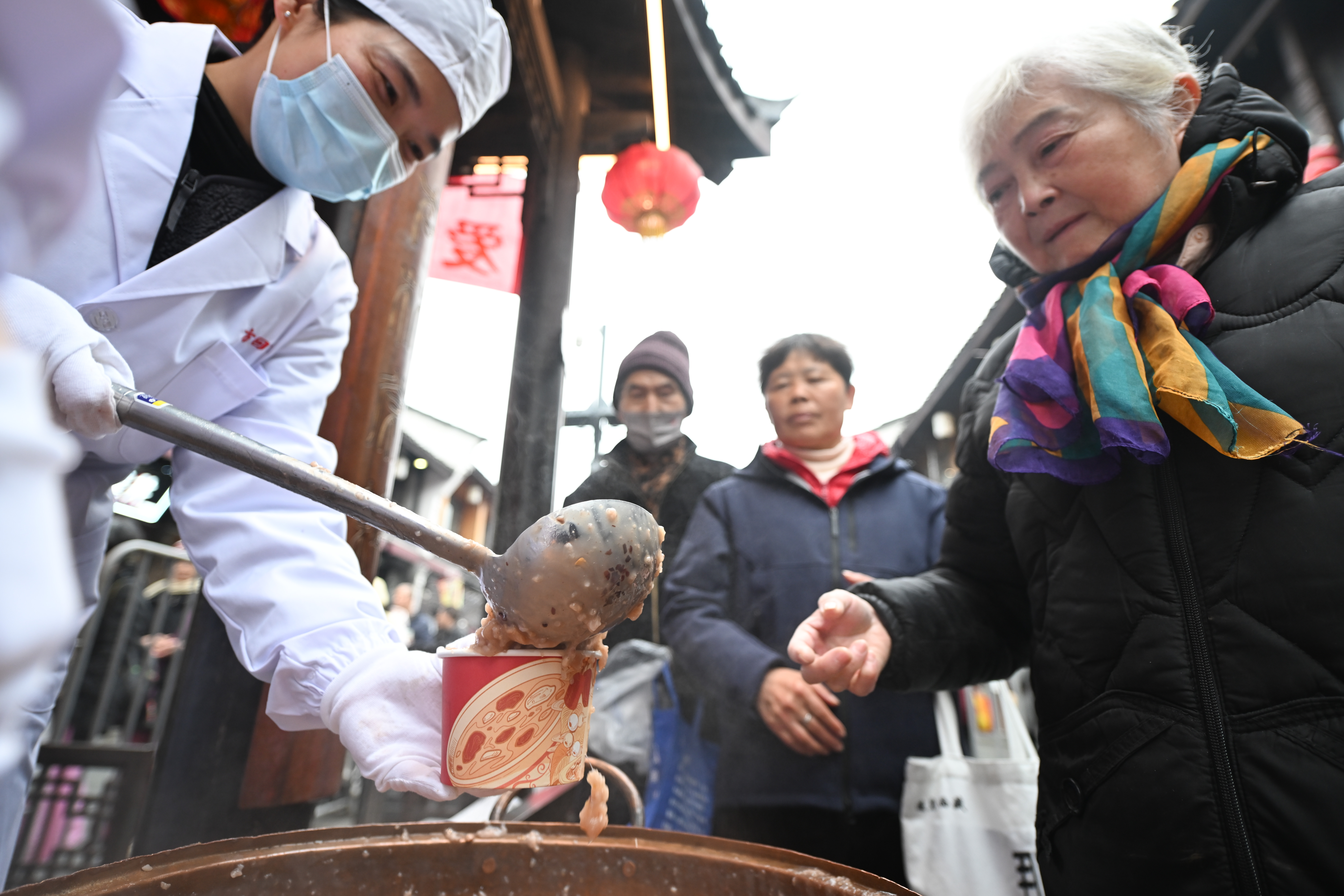 1月26日,在浙江杭州,百年老字号方回春堂派发健康养生腊八粥,吸引不少市民领取和品尝。中新社