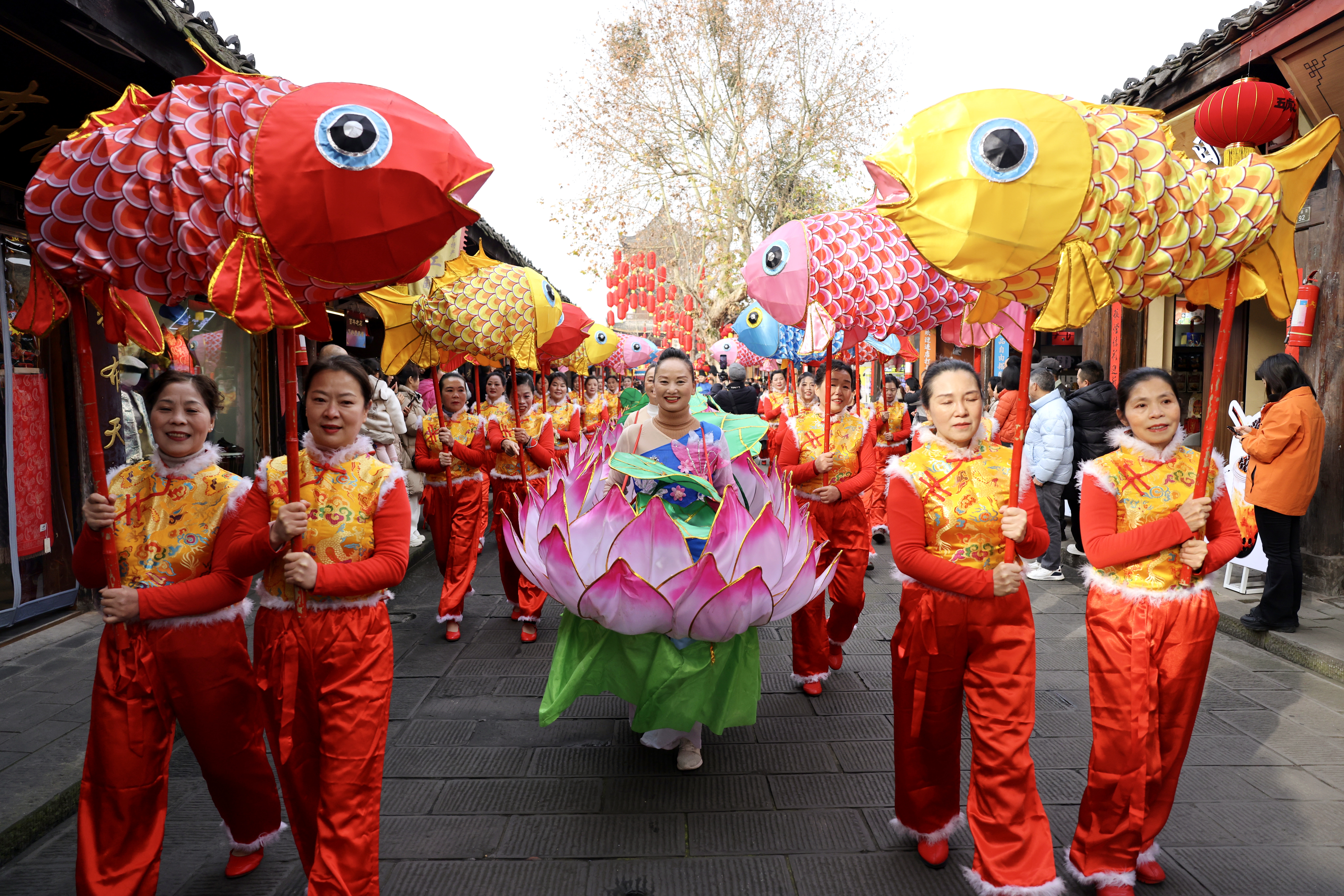 1月26日,在四川阆中,鱼灯和采莲船在古城中巡游。中新社