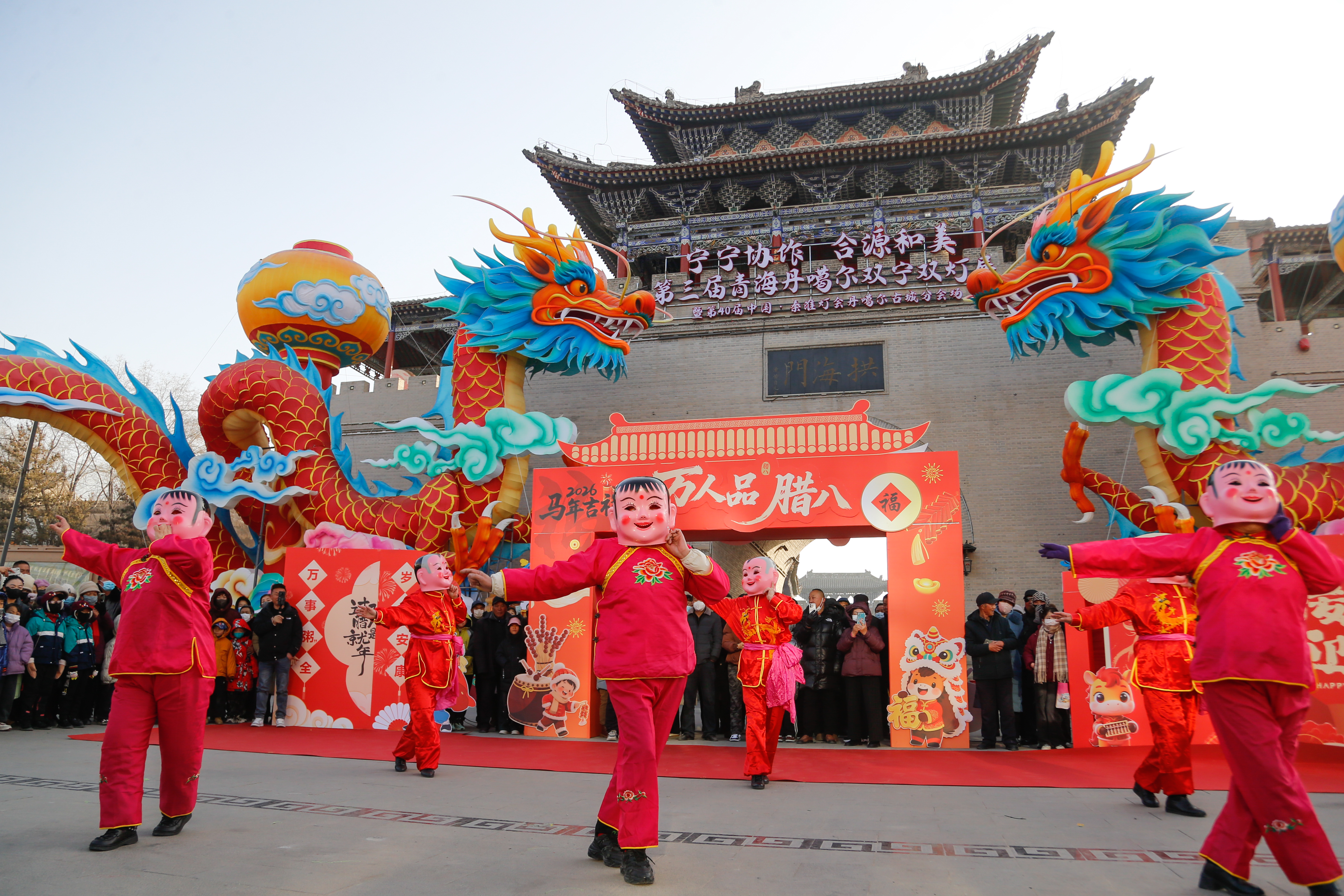 1月26日是农历腊八节,中国多地以巡游、品粥、民俗体验等形式迎新春,呈现出一幅喜庆祥和、传承文化的节庆画卷。图为1月26日,青海省西宁市湟源县举行第十三届丹噶尔古城“万人品腊八”活动。民众在古城内品尝麦仁腊八粥、琪玛会(杀猪宴),体验“抛绣球招亲”、剪纸等活动。图为现场歌舞表演。中新社