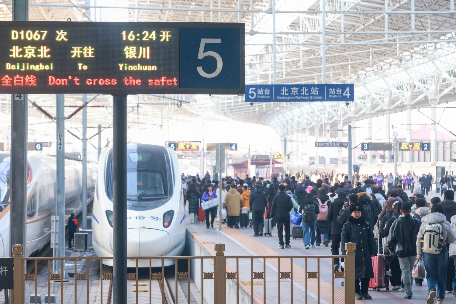 1月26日,中国铁路实施新的列车运行图。调图后,北京北站新增至银川动车组列车,最快运行时间6小时22分。图为旅客在北京北站乘坐开往银川的D1067次列车。中新社