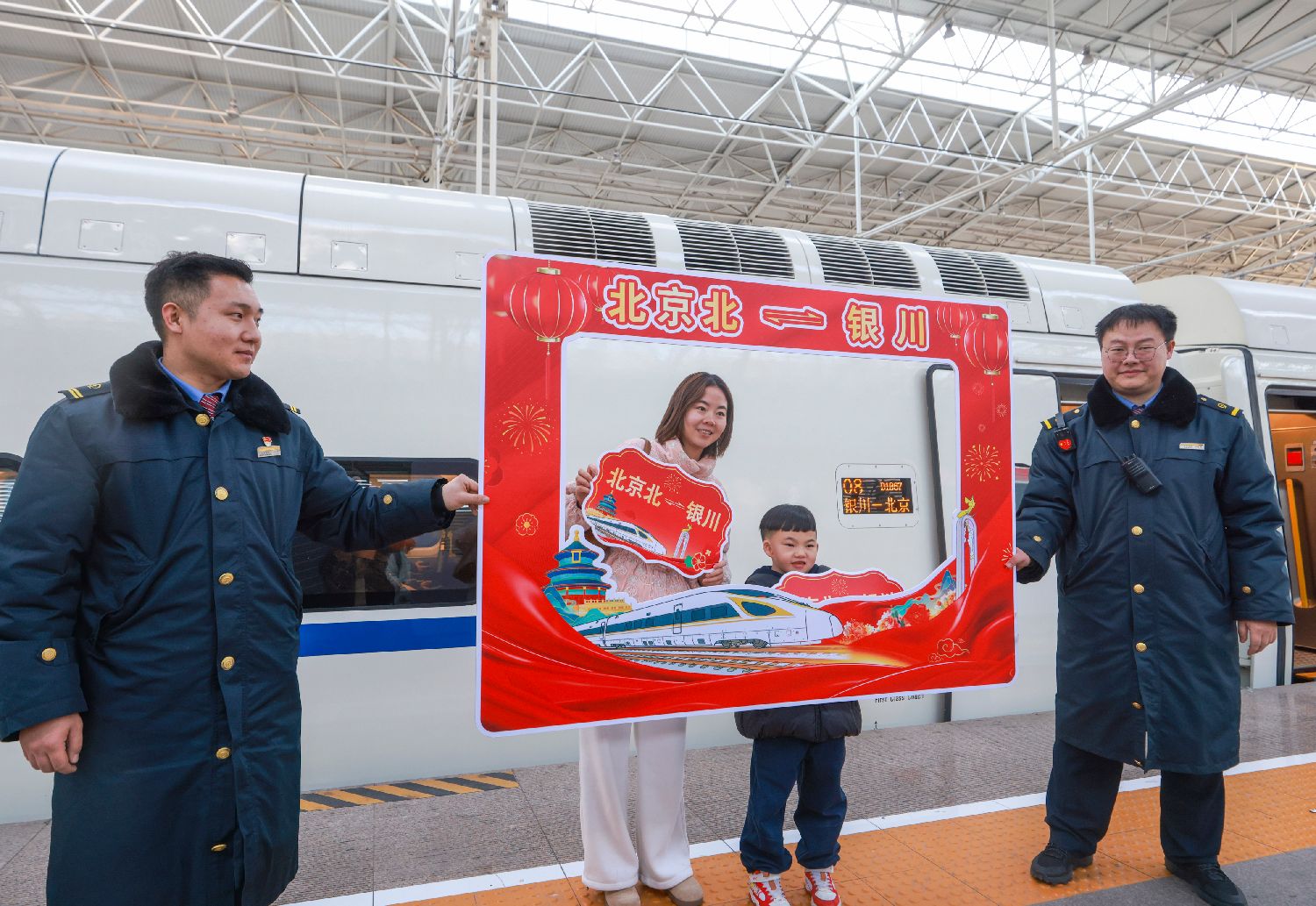 1月26日,家长带着小朋友在北京北站乘坐开往银川的D1067次列车。中新社