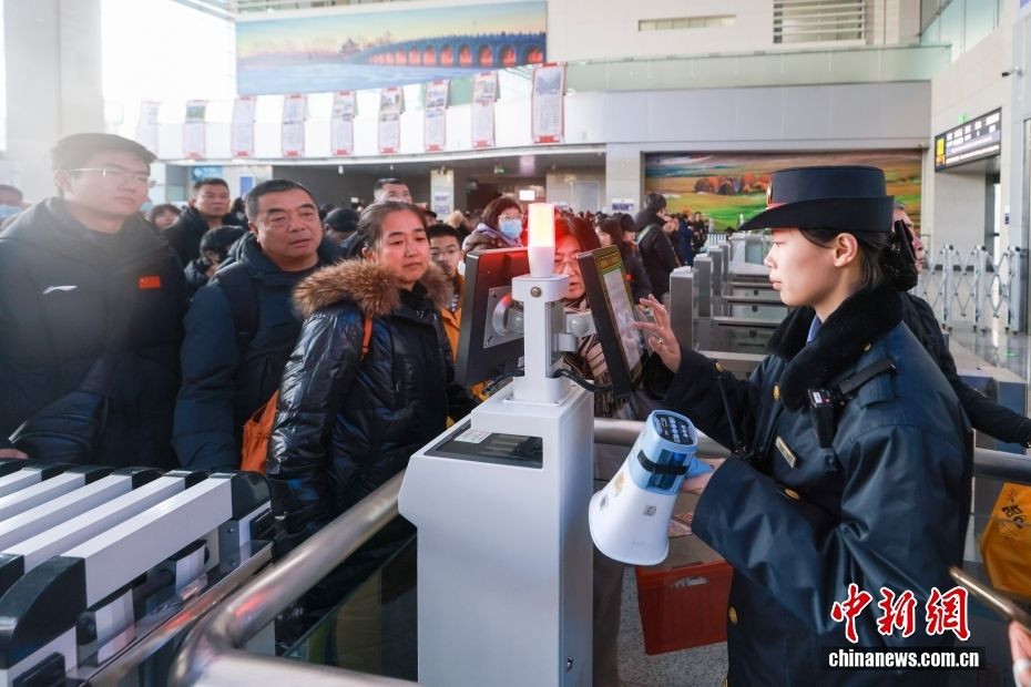 1月26日,北京北站客运员为去往银川的旅客检票。中新网