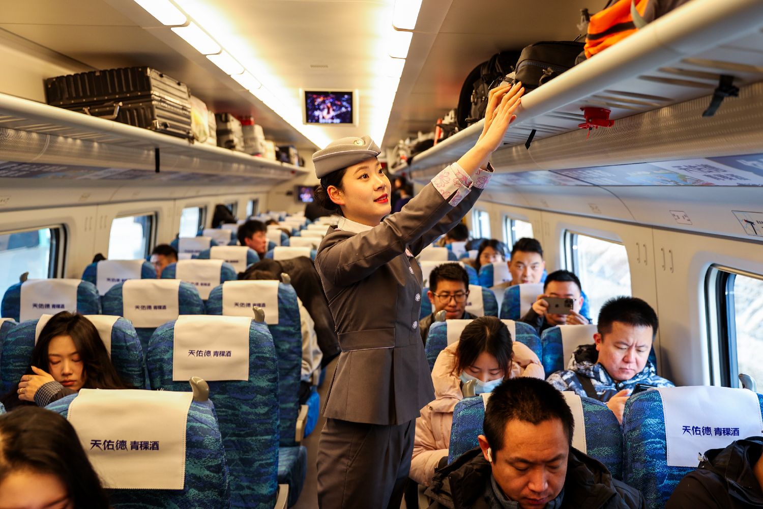 北京时间1月26日11时15分,青海西宁至北京北首次开行动车组列车。与既有西宁至北京普速列车相比,该趟动车组旅行时间最多可减少11小时48分。图为动车组乘务员在车厢内整理旅客行李。中新社