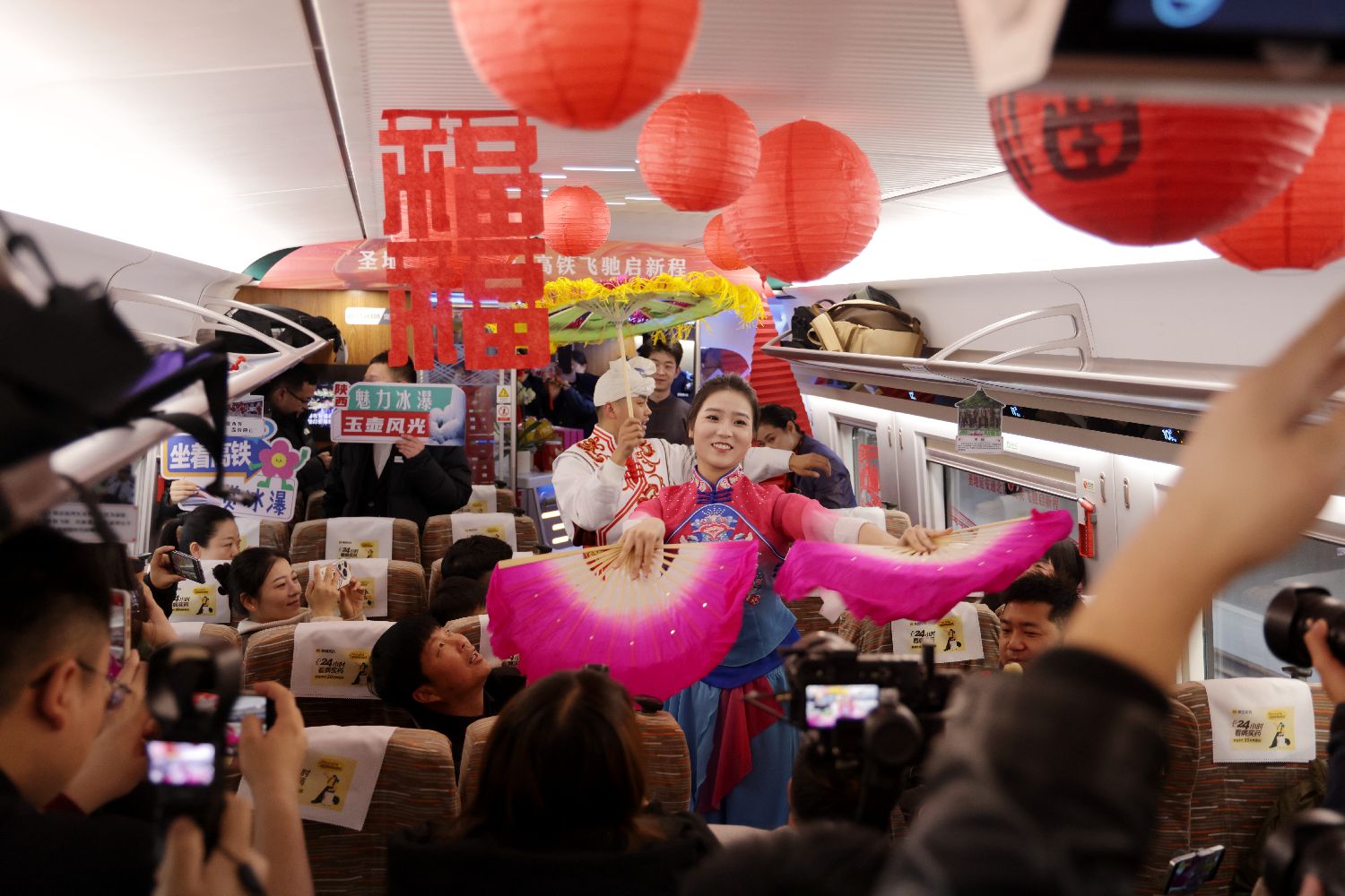 1月26日,随着G359次列车从延安站缓缓驶出,标志着延安与北京首次实现高铁直连,延安正式接入中国高铁网。据悉,延安站至北京西最快5小时42分可达,较之前压缩了4小时37分。图为列车上的秧歌表演。中新社