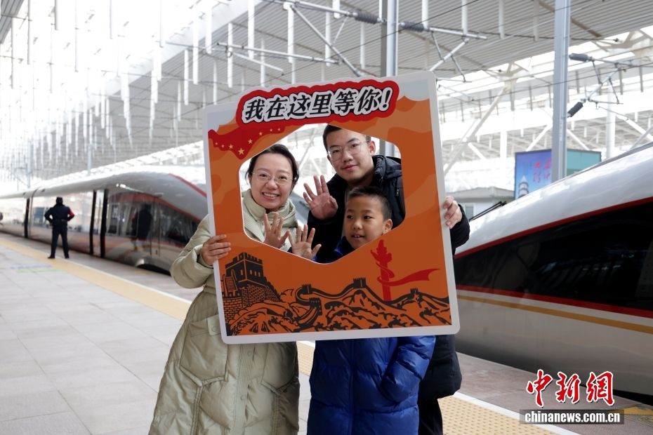 1月26日,G8859/60次京津冀环线高铁在北京西站发车前,旅客在站台打卡拍照。中新社