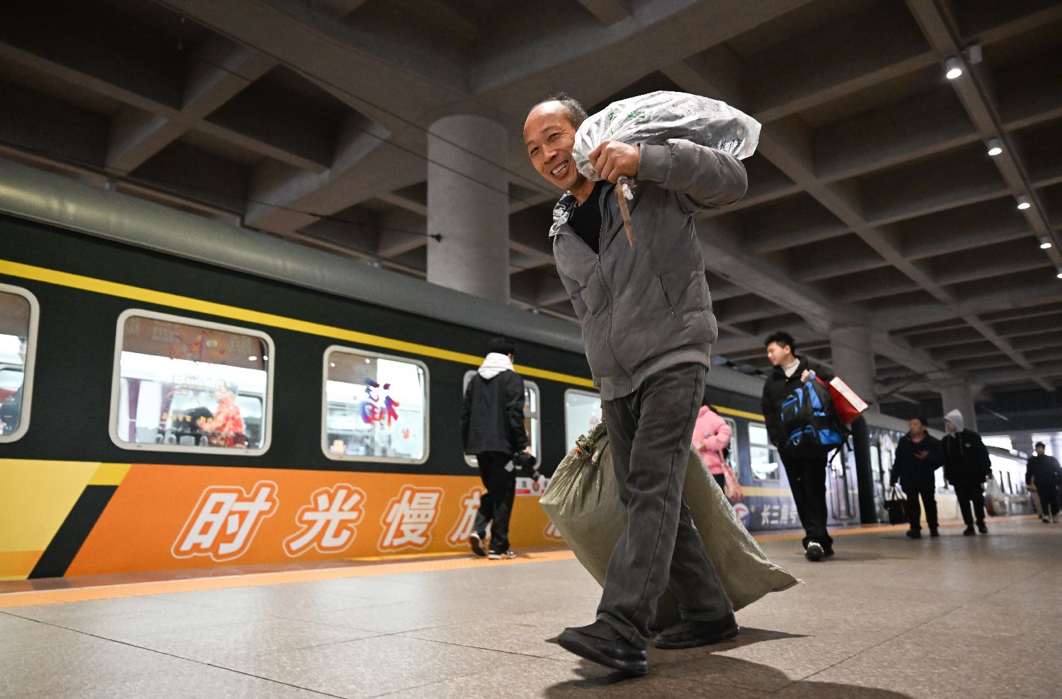 1月27日,2026年春运长三角首趟临时旅客列车K1248次从浙江宁波站出发,载着数百名旅客踏上返乡路。据悉,长三角去往云贵、川渝、东北等多个重点方向的长途客流已于近日陆续启动。图为旅客带着行李赶火车。中新社