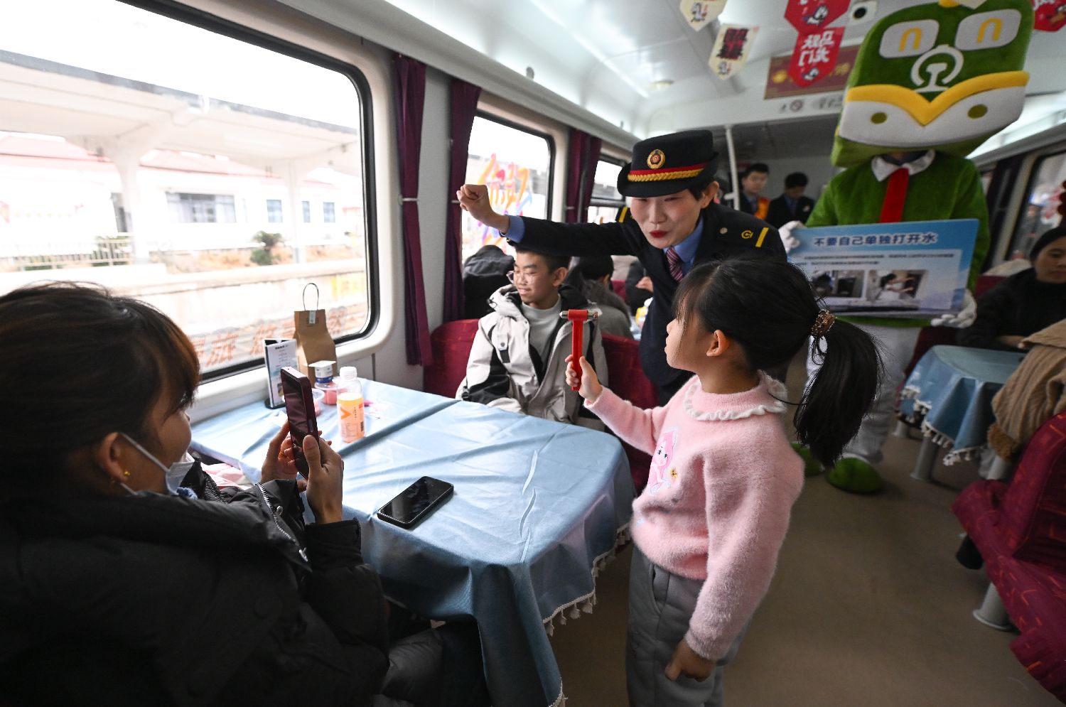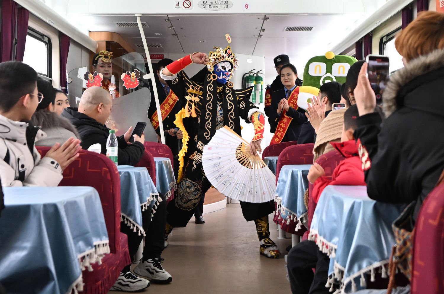 1月27日,K1248次车厢内精彩的变脸表演吸引旅客。中新社