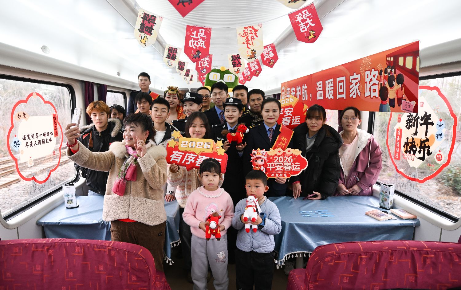1月27日,K1248次乘务员、乘警等和旅客合影。中新社