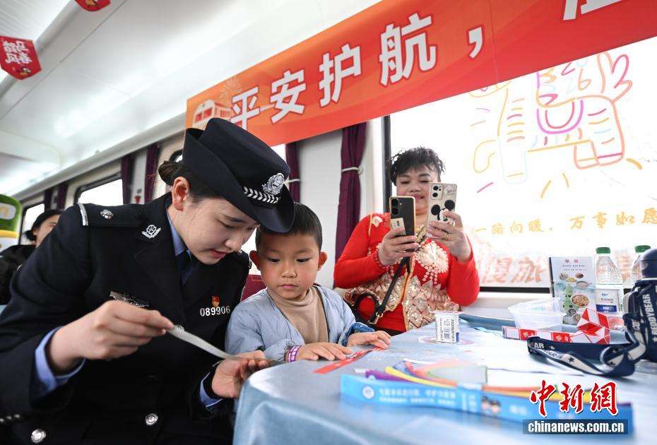 1月27日,乘警在车厢内为旅客普及彩色行李防丢带的使用方法。中新网