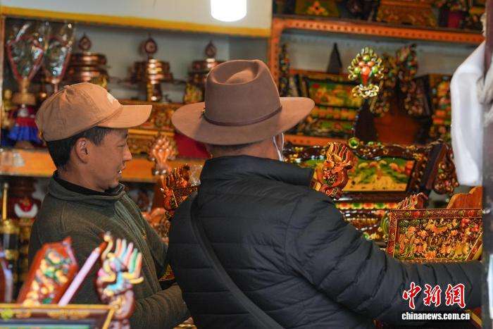 市民在八廓商城选购年货香布(藏式建筑门窗上装饰的五彩布料)。