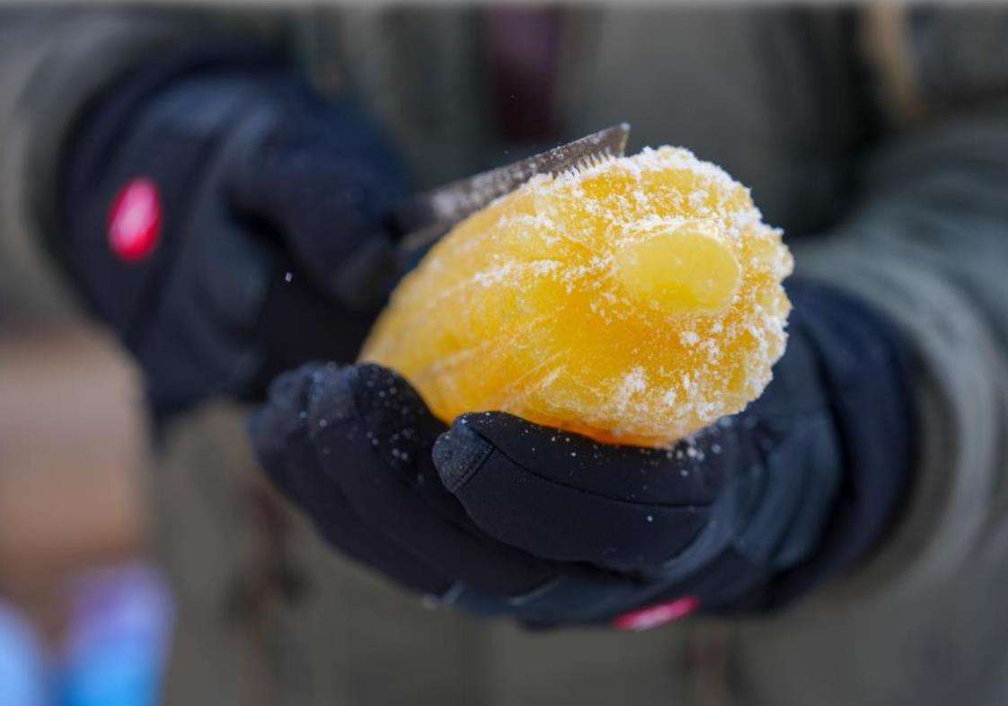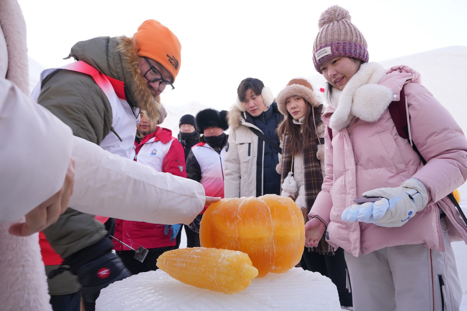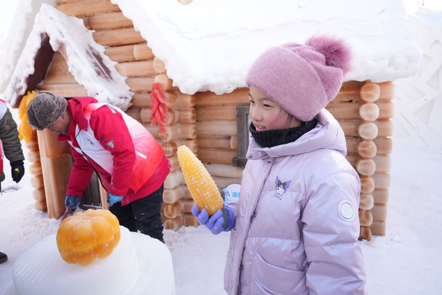 1月28日,小朋友手拿彩色冰制作的玉米冰雕。中新社