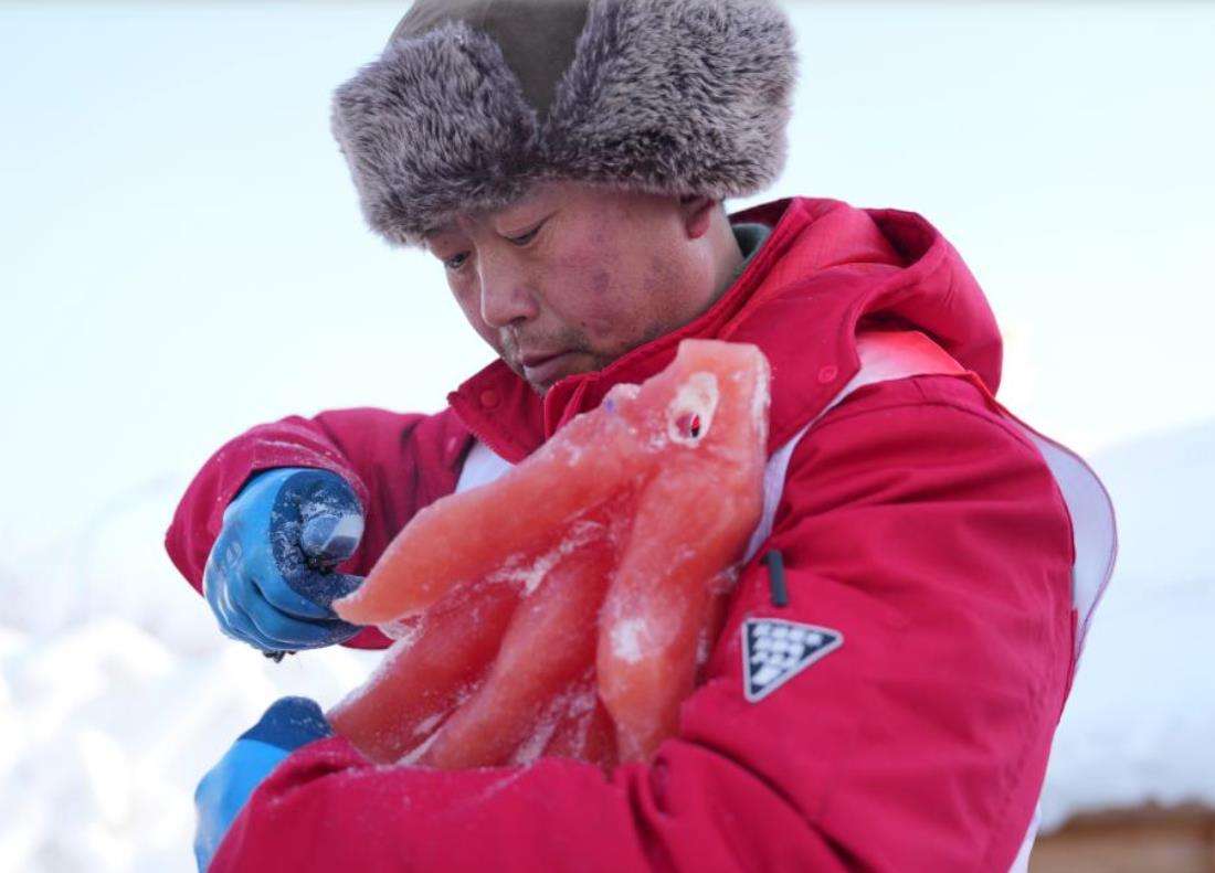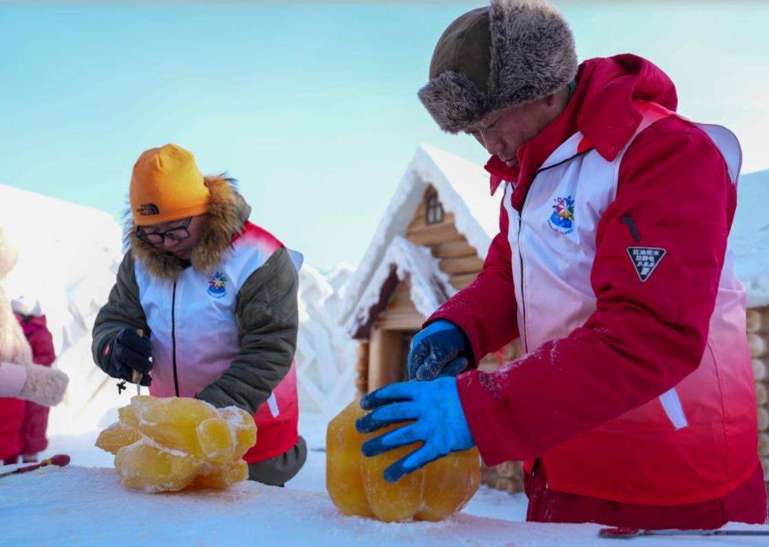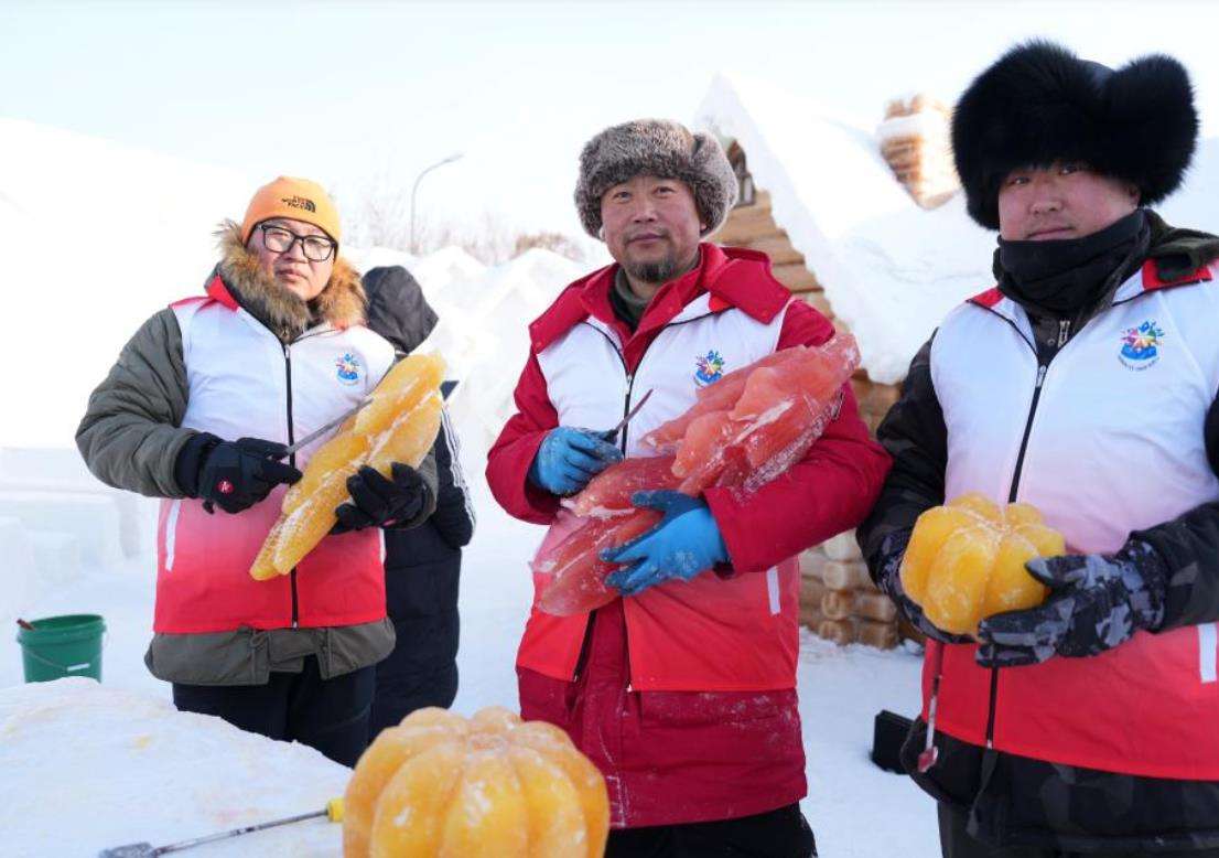 1月28日,冰雕师创作玉米冰雕。新华社