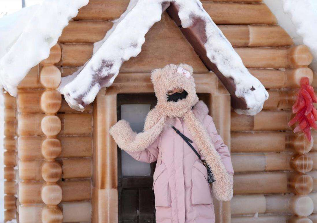 1月28日,参观者在哈尔滨冰雪大世界园区中的植物彩色冰雕房屋前拍照。新华社