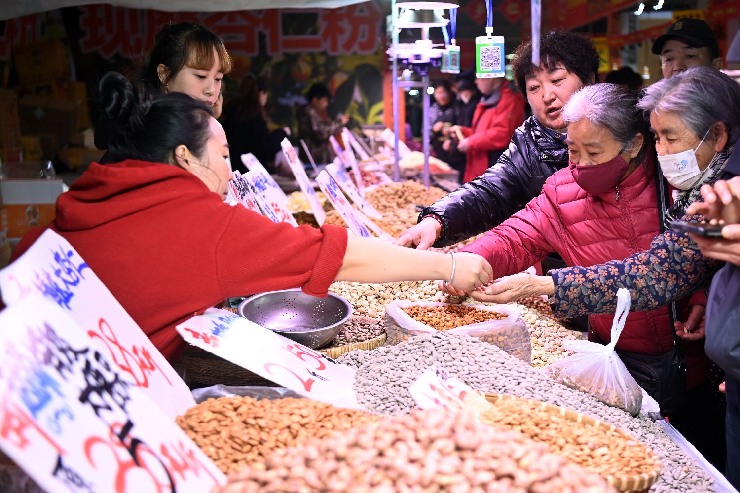 参加年货大集的民众选购坚果。中新社