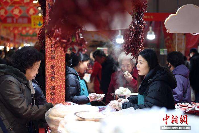 民众在一个摊位前了解年货美食。中新网