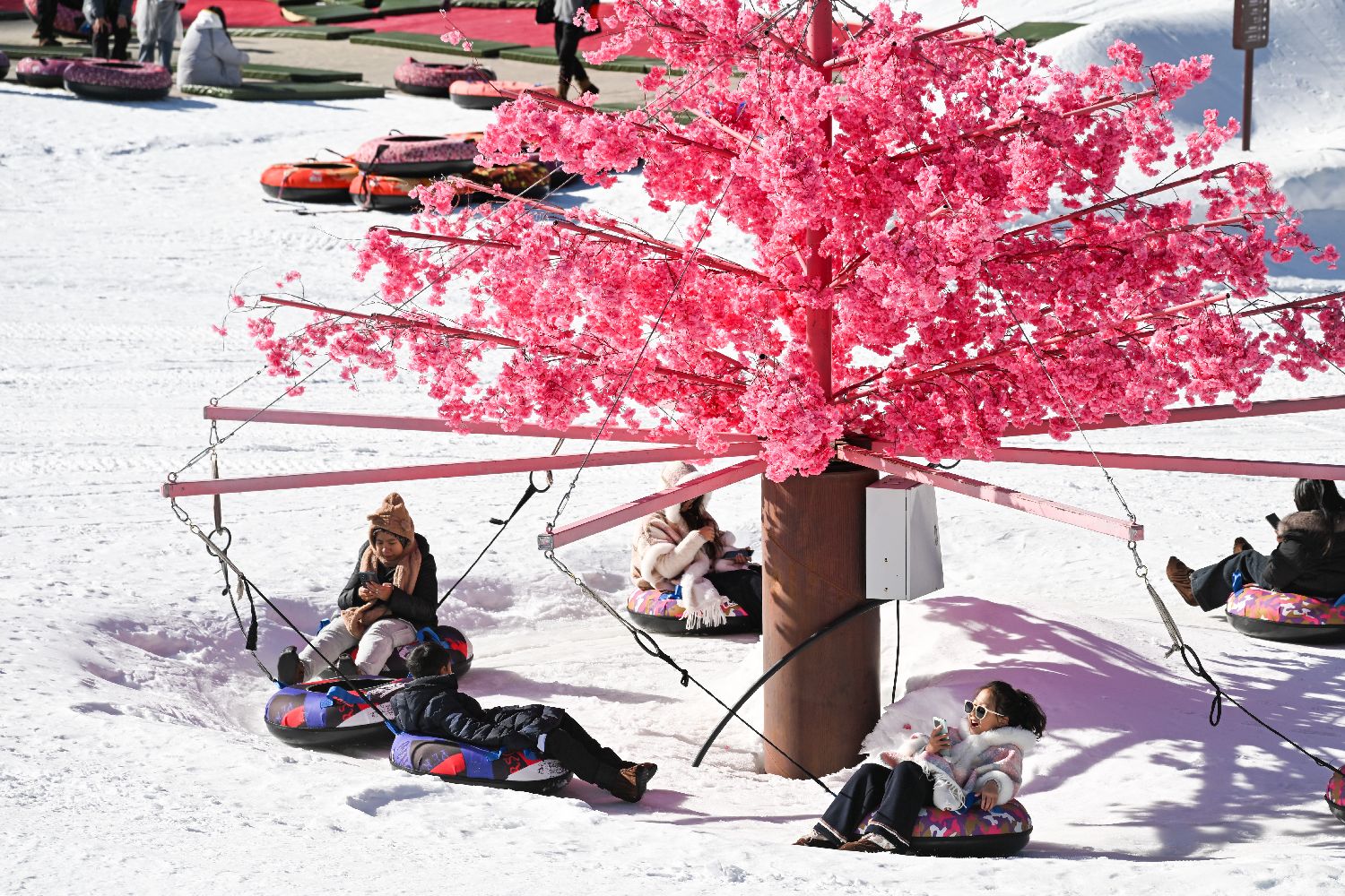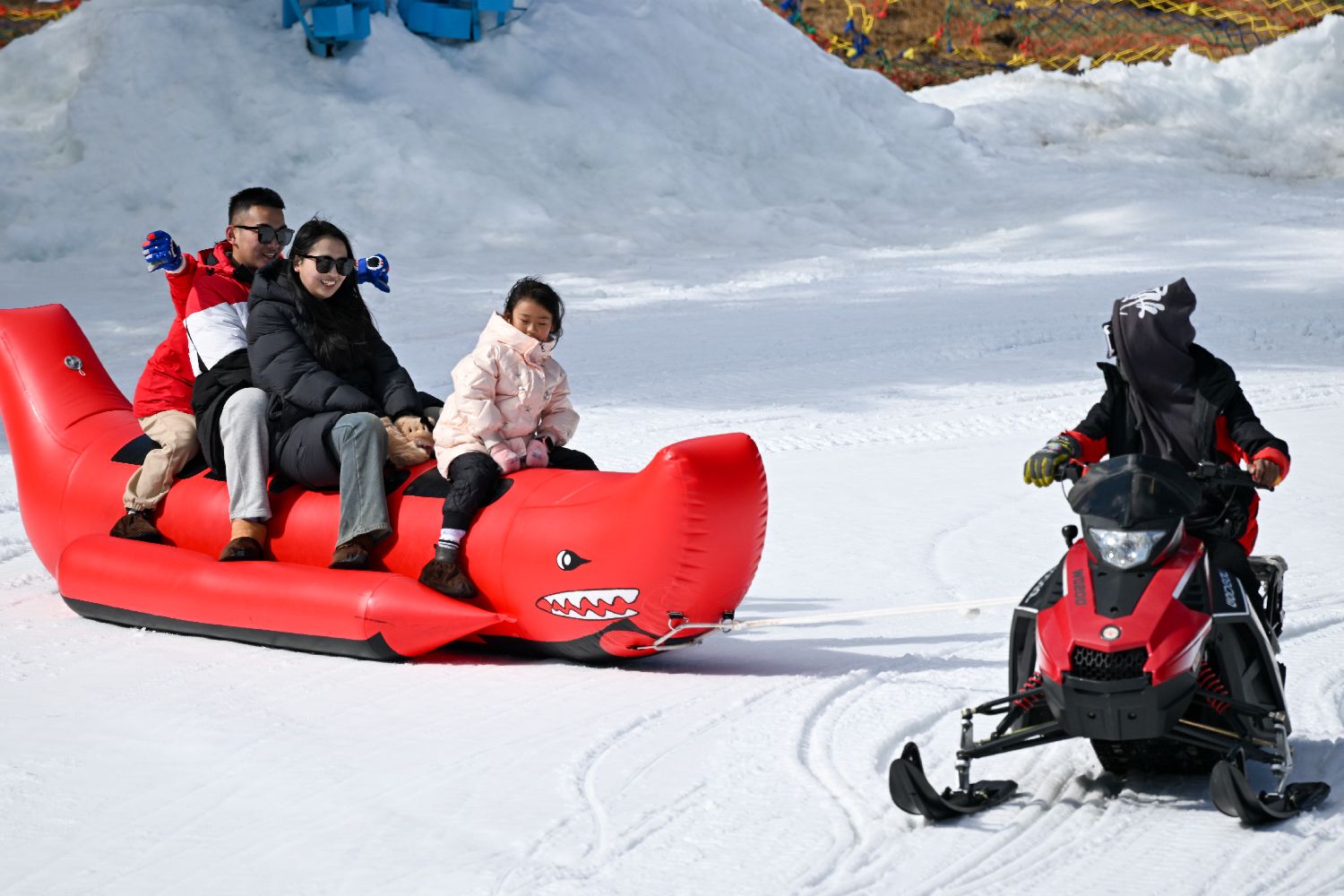 1月29日,游客乘坐“雪地鲨鱼船”体验冰雪魅力。中新社